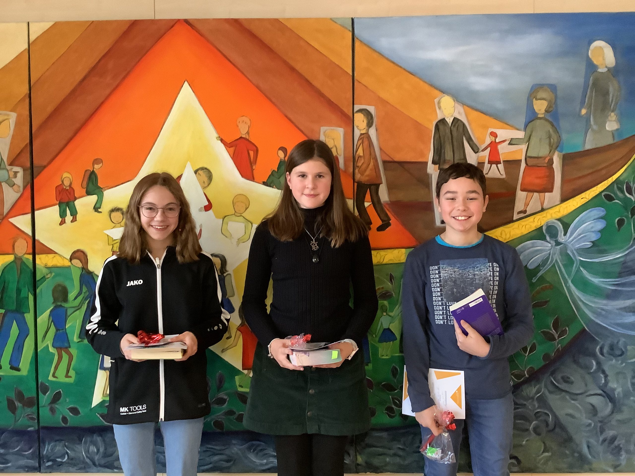 Im Rahmen des bundesweiten Vorlesewettbewerbs traten heute die Klassensieger der 6. Klassen gegeneinander an. Vor dem ungewohnt großen Publikum mit allen Schülern der sechsten Jahrgangsstufe lasen Lena Zenner (6a), Laura Rechbauer (6b) und Alvaro Zimmermann (6c) vor und überzeugten alle mit schönen Vorträgen. Als Schulsiegerin tat sich letztendlich Lena hervor und darf unsere Schule beim Kreisentscheid vertreten.