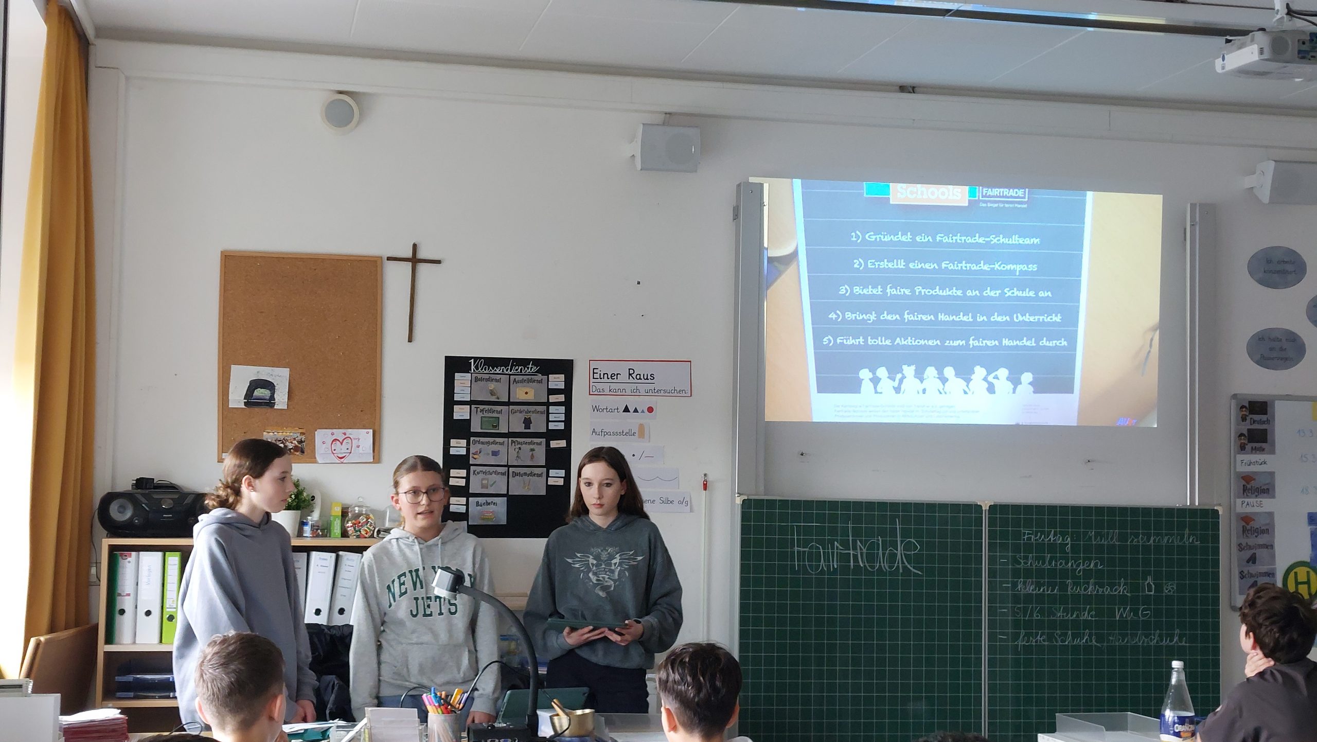 Zu unserer fairen Woche vom 26.9. bis 2.10. gab es eine Vielfalt von Aktionen rund um das Motto „Fair handeln – Vielfalt erleben“. Gleich am Eingang führte das von Schülern gemalte Plakat in das Thema ein. Gleichzeitig gab es Aktionen für alle Jahrgangsstufen. Bereits am ersten Schultag wurden die neuen 5. Klässler mit einem Geschenk der Fairtrade-AG überrascht, denn alle erhielten ein Mäppchen aus fair gehandelter Baumwolle mit einem Stift von Fairtrade Deutschland und einer von der Fairtrade Town Illertissen gestifteten Guten Schokolade. Alle Klassen besuchten die vom Fairtrade-Team gestaltete Fairtrade Ausstellung, bei der es anhand eines Rätsel- Spiels viel über die Produkte und Produzenten aus dem Globalen Süden zu entdecken gab. In jeder Jahrgangsstufe fand ein Projekt zum Thema „Vielfalt durch Fairtrade“ statt. So erhielten die 7. Klassen Einblick in die Herkunft und Bedeutung der Lebensmittel aus den Ländern der Dritten Welt. In die 5. Klassen kamen außerdem die Fairtrade-Botschafter zu Besuch und die Wahrung der Schöpfung wurde beim Thema „Mülltrennung“ eingeübt. Die 8. Klassen erlebten zwei Vorträge, die ihnen einerseits die fair gehandelten Produkte und deren Herkunft anschaulich präsentierten. Ein Referent von „Terres des Hommes“ klärte die Schüler über die Bedeutung der Kinderrechte und über die Situation junger Menschen in den Entwicklungsländern auf und rief sie zum Einsatz für ihre Rechte auf. In den 6. Klassen sensibilisierte ein Online-Spiel die Schüler für den achtsamen Klimaschutz und ließ mögliche Folgen anschaulich werden. Die 9. Klassen führten im Deutschunterricht eine Werte-Debatte durch.