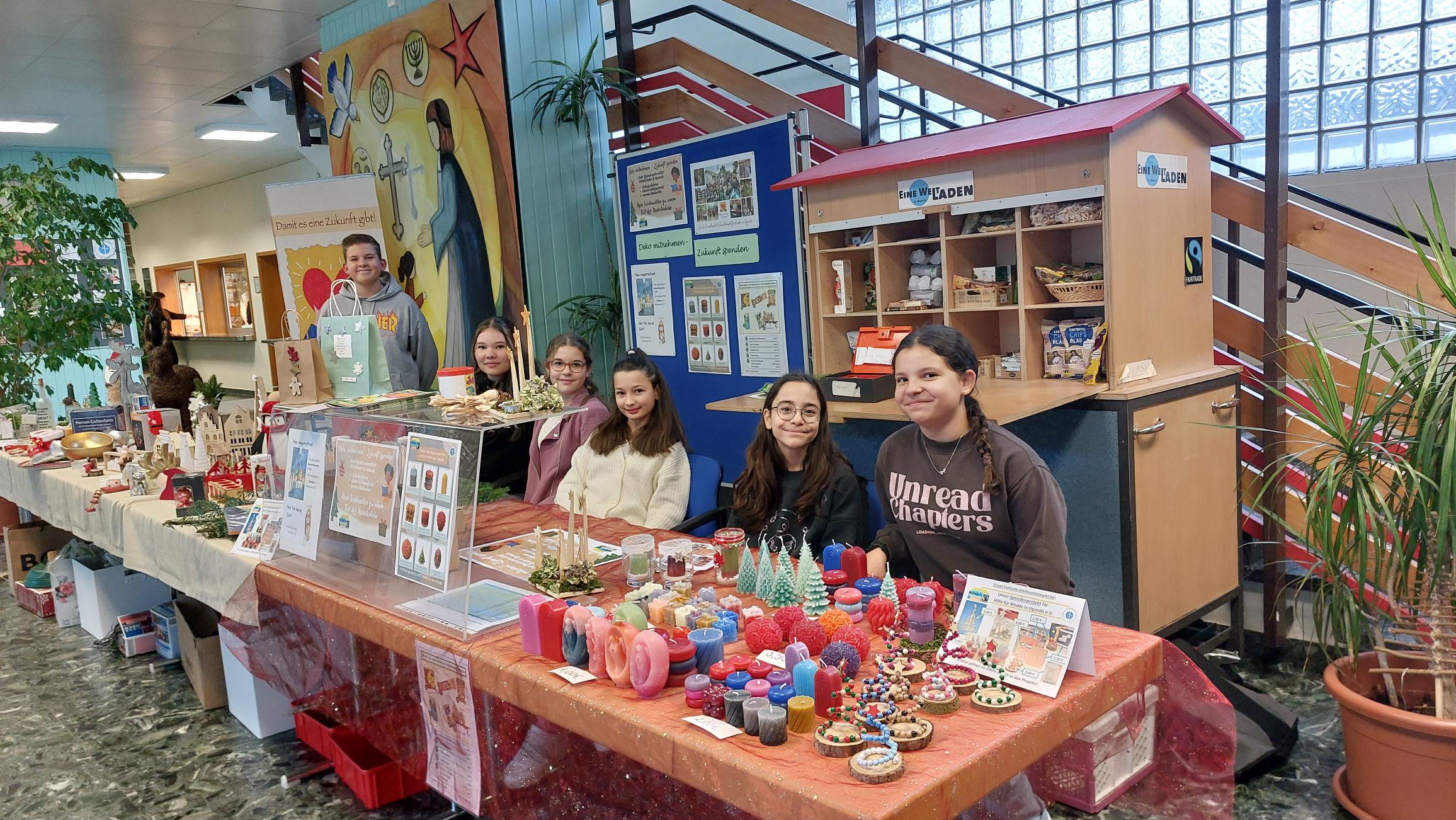 Mit dem Verkauf von Secondhand-Weihnachts-Deko-Artikeln sammeln die Mitglieder der Fairtrade-AG Spenden an den Elternsprechtagen und nach dem Weihnachtskonzert. Die damit eingenommenen Gelder kommen dem Projekt „Hilfe für Kinder in Uganda e. V.“ zugute, wodurch jungen Meschen in diesem afrikanischen Land Schulbildung ermöglicht wird.