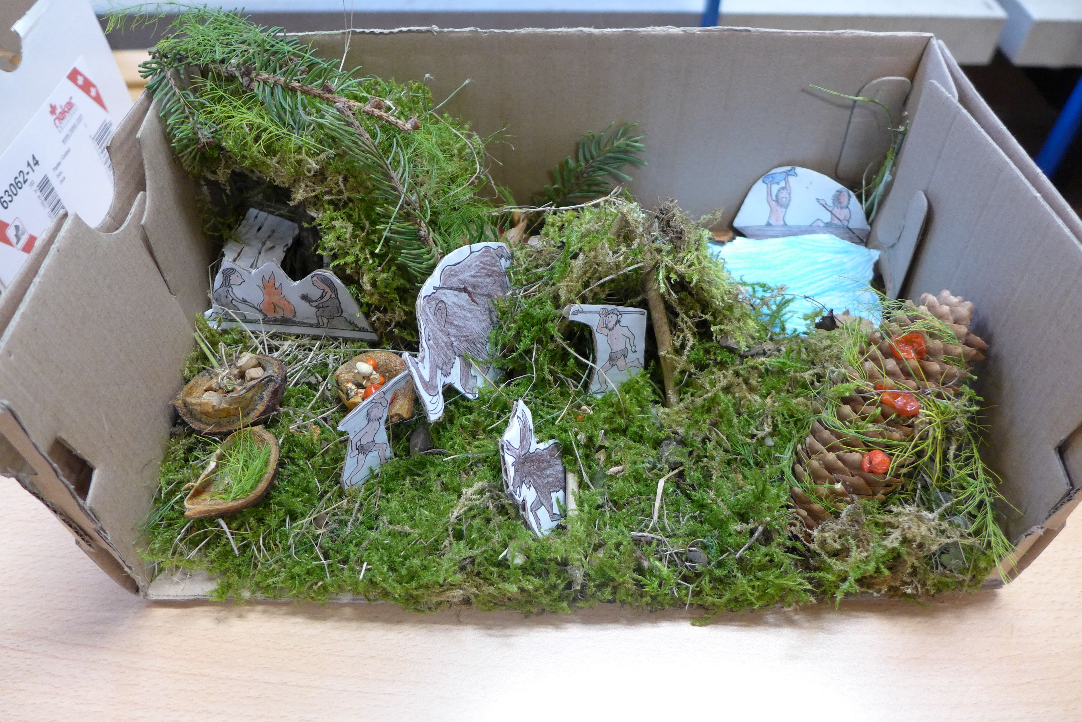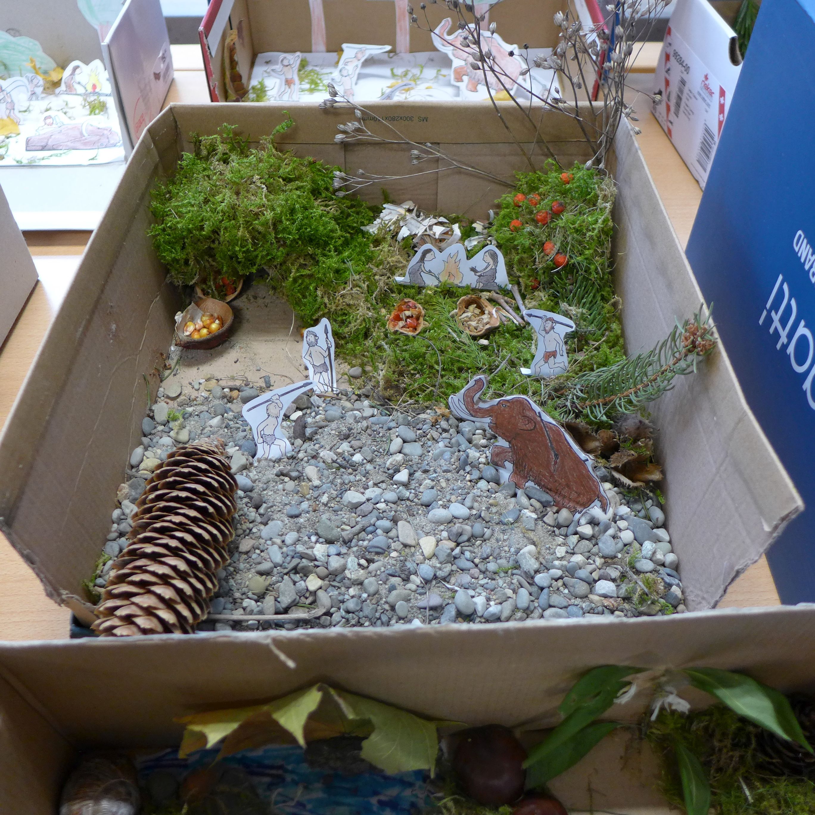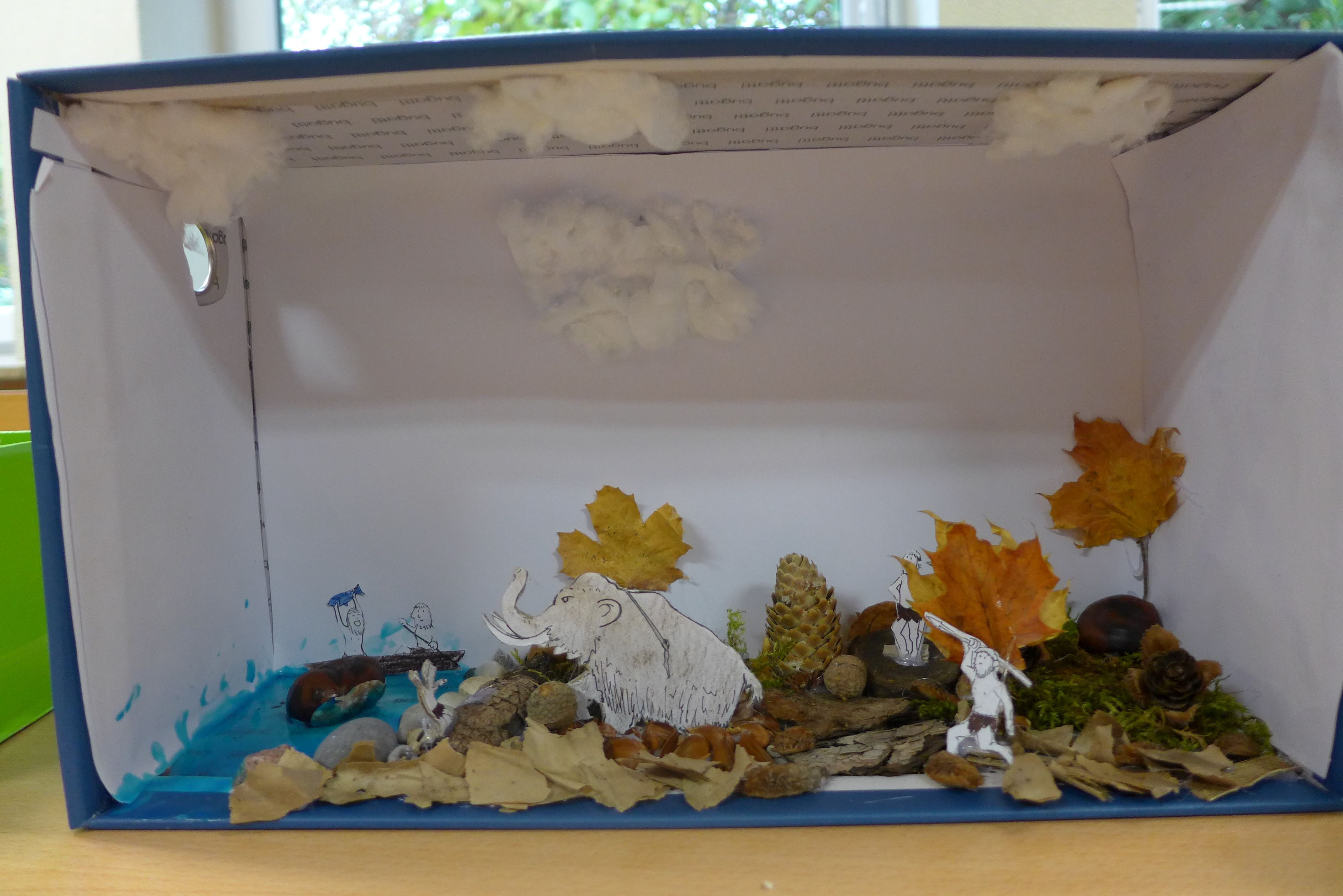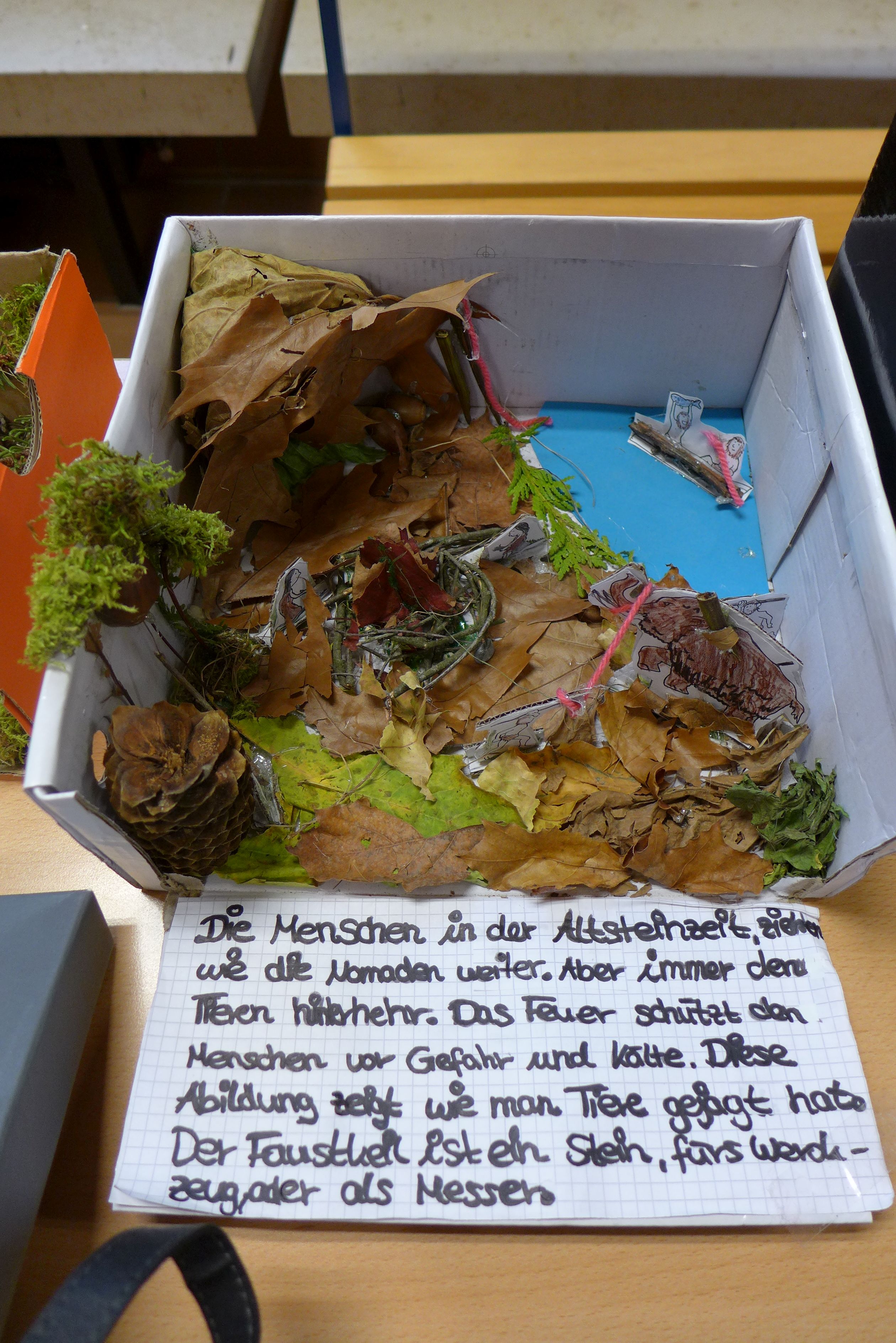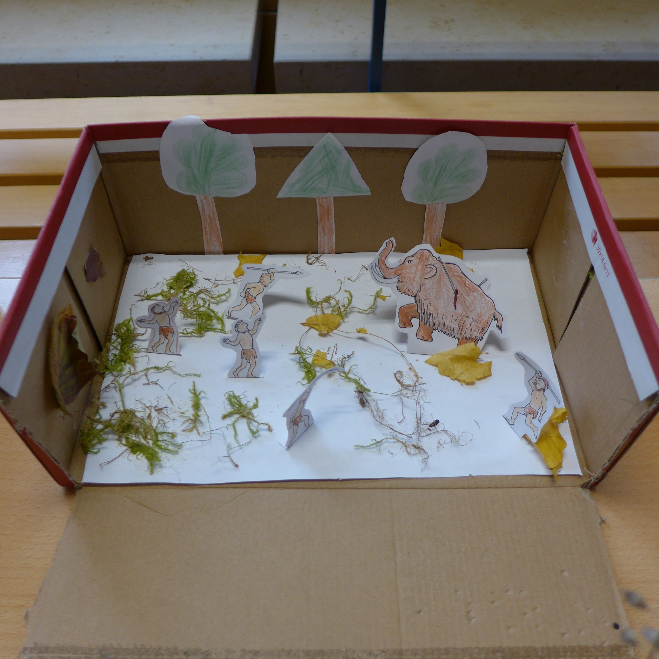 In einem dreistündigen Miniprojekt sollten die Schülerinnen und Schüler der sechsten Klassen im Fach Geschichte die Jagdszene durch das Darstellen einer Altsteinzeitlichen Jagdszene in einem Schuhkarton („History in a box“) weitererzählen.