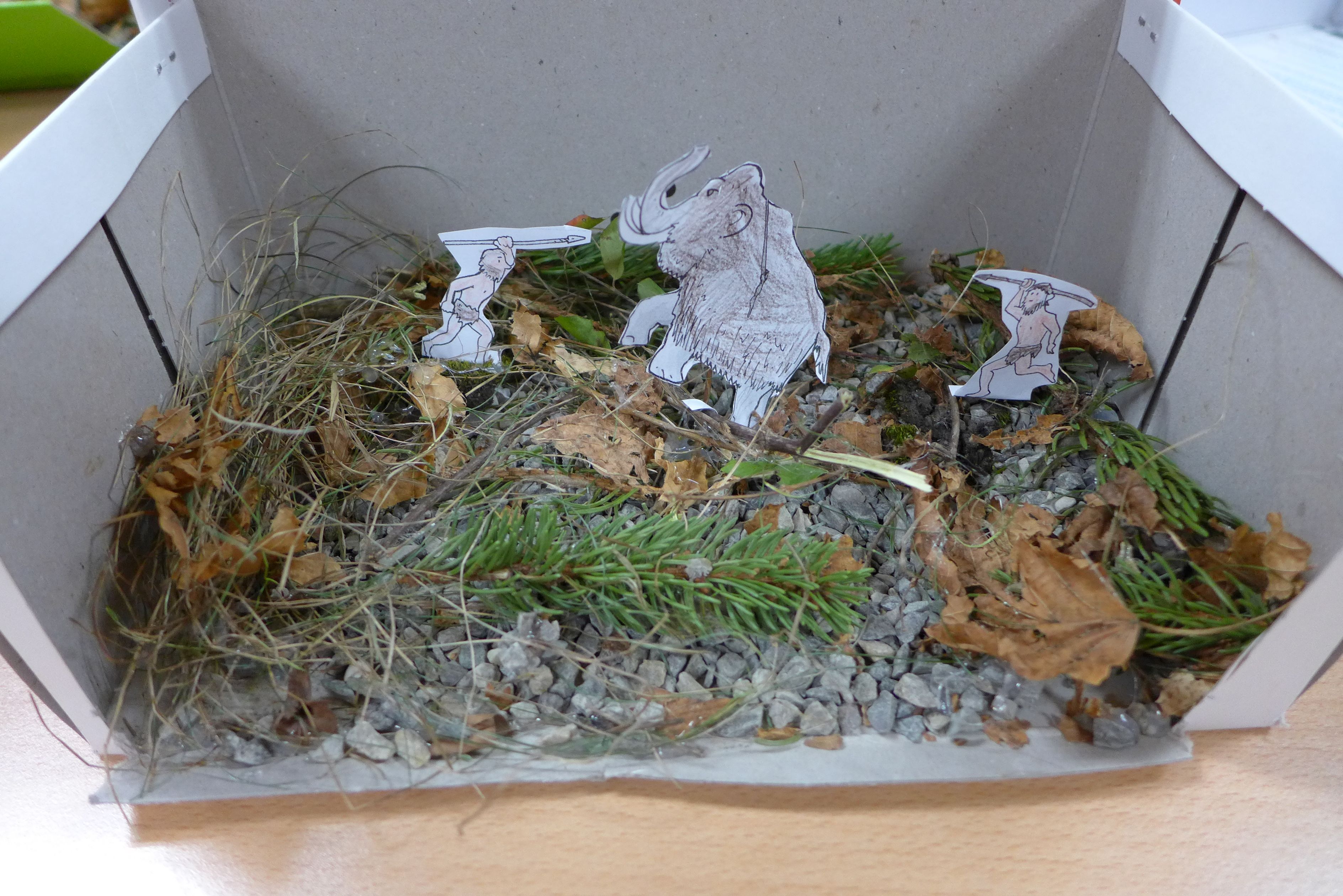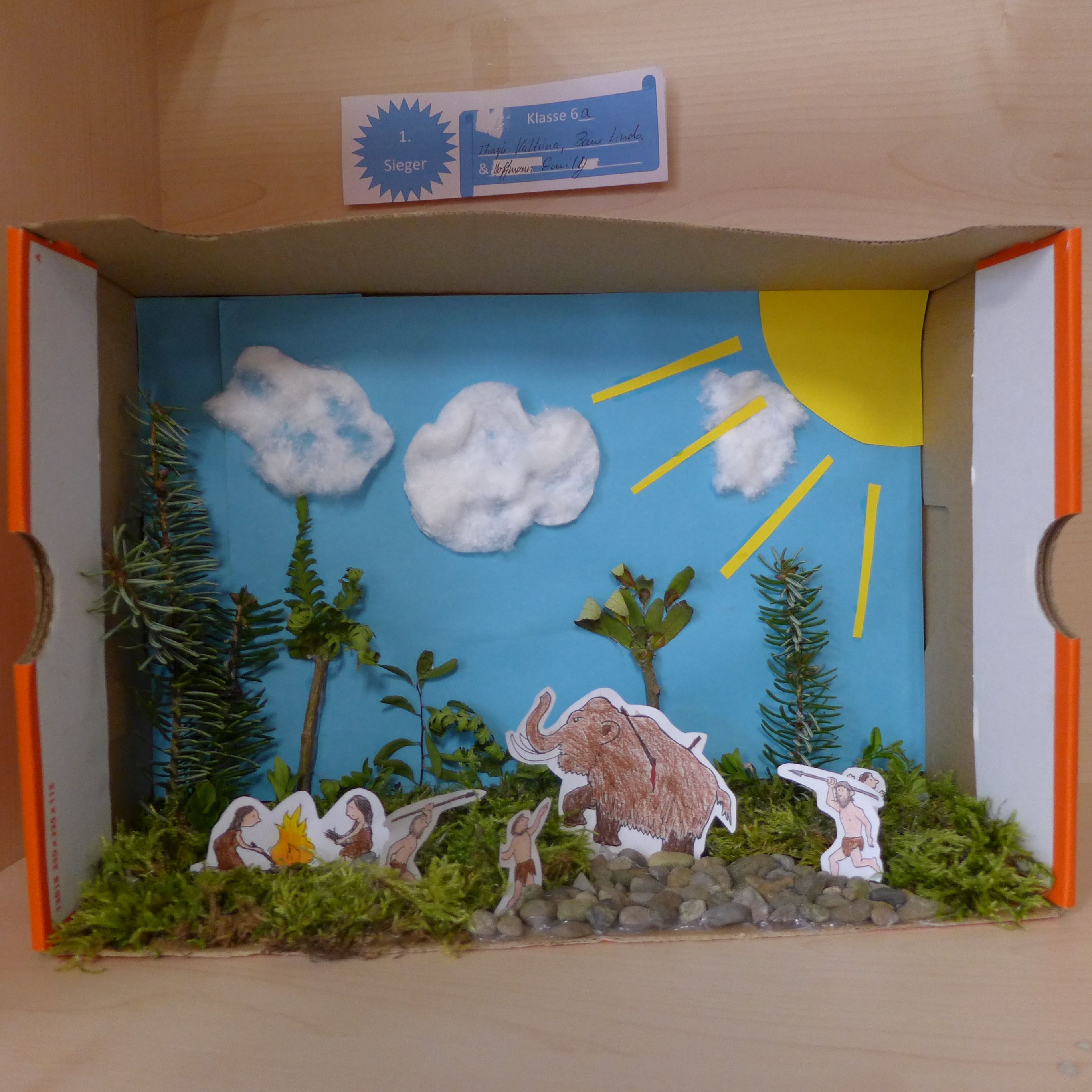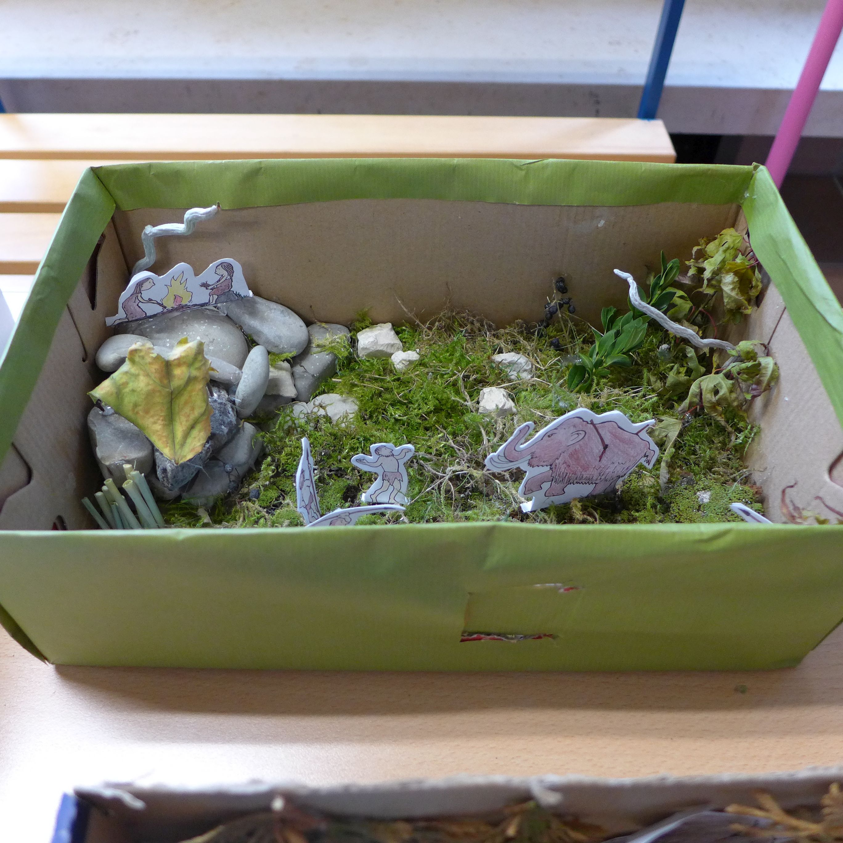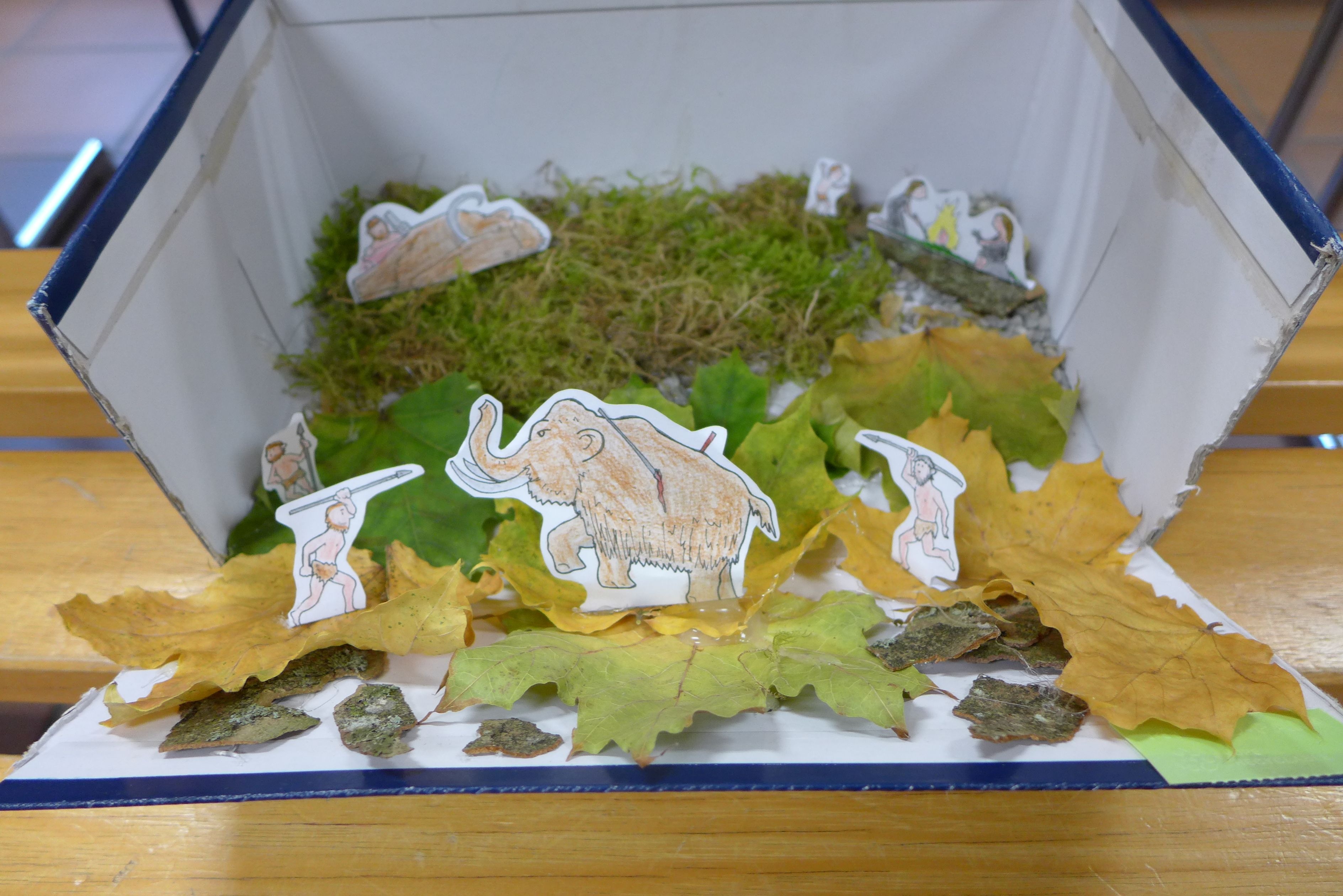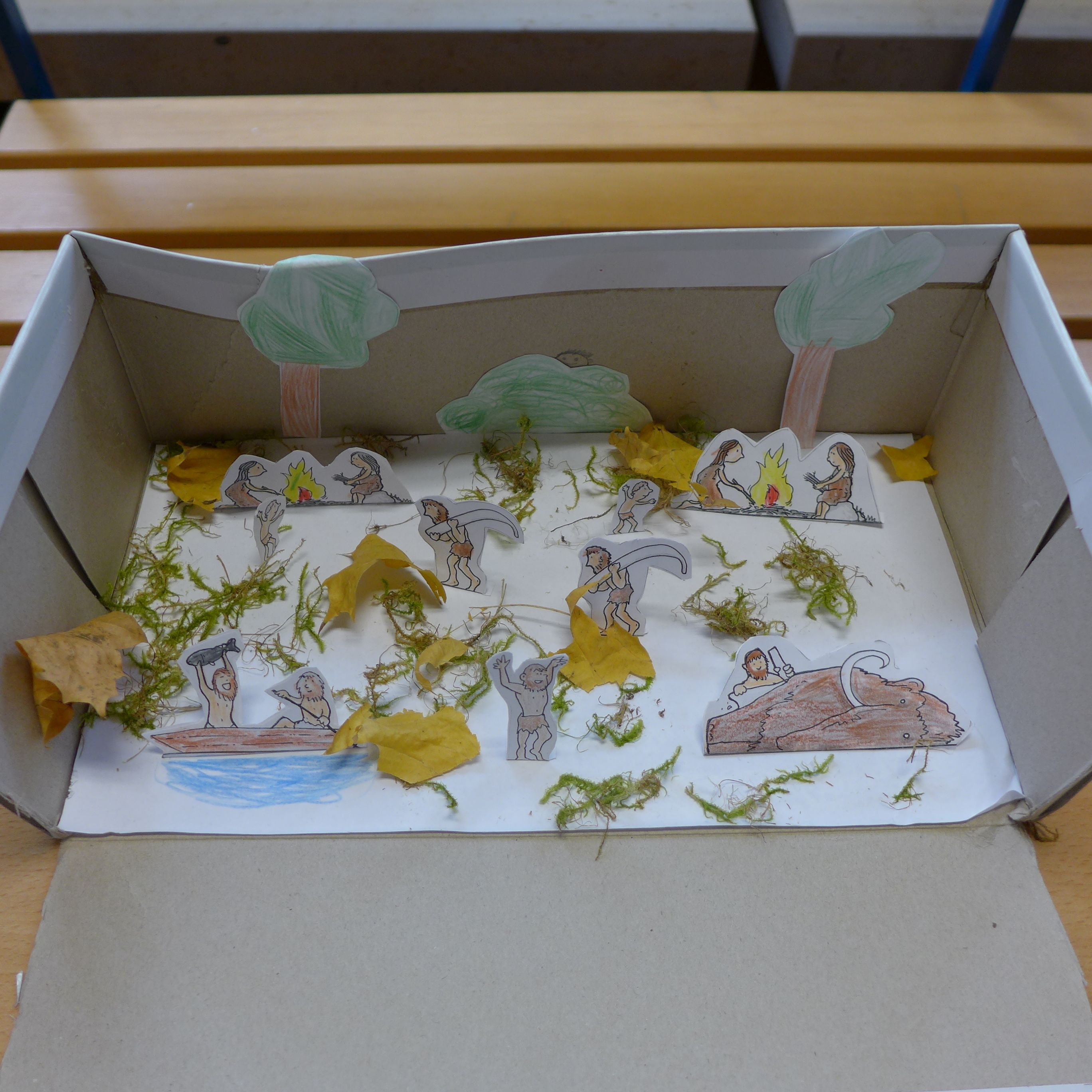 In einem dreistündigen Miniprojekt sollten die Schülerinnen und Schüler der sechsten Klassen im Fach Geschichte die Jagdszene durch das Darstellen einer Altsteinzeitlichen Jagdszene in einem Schuhkarton („History in a box“) weitererzählen.