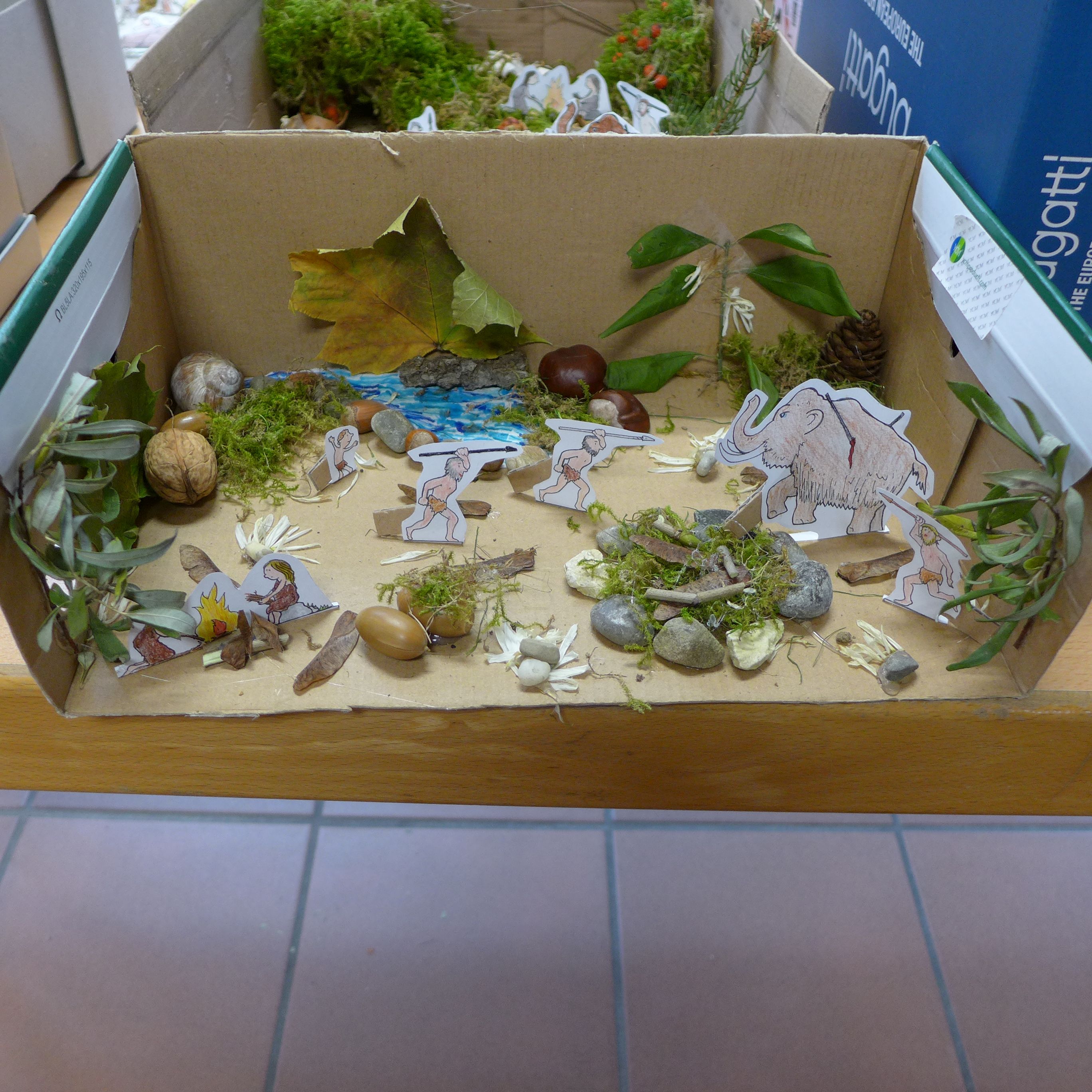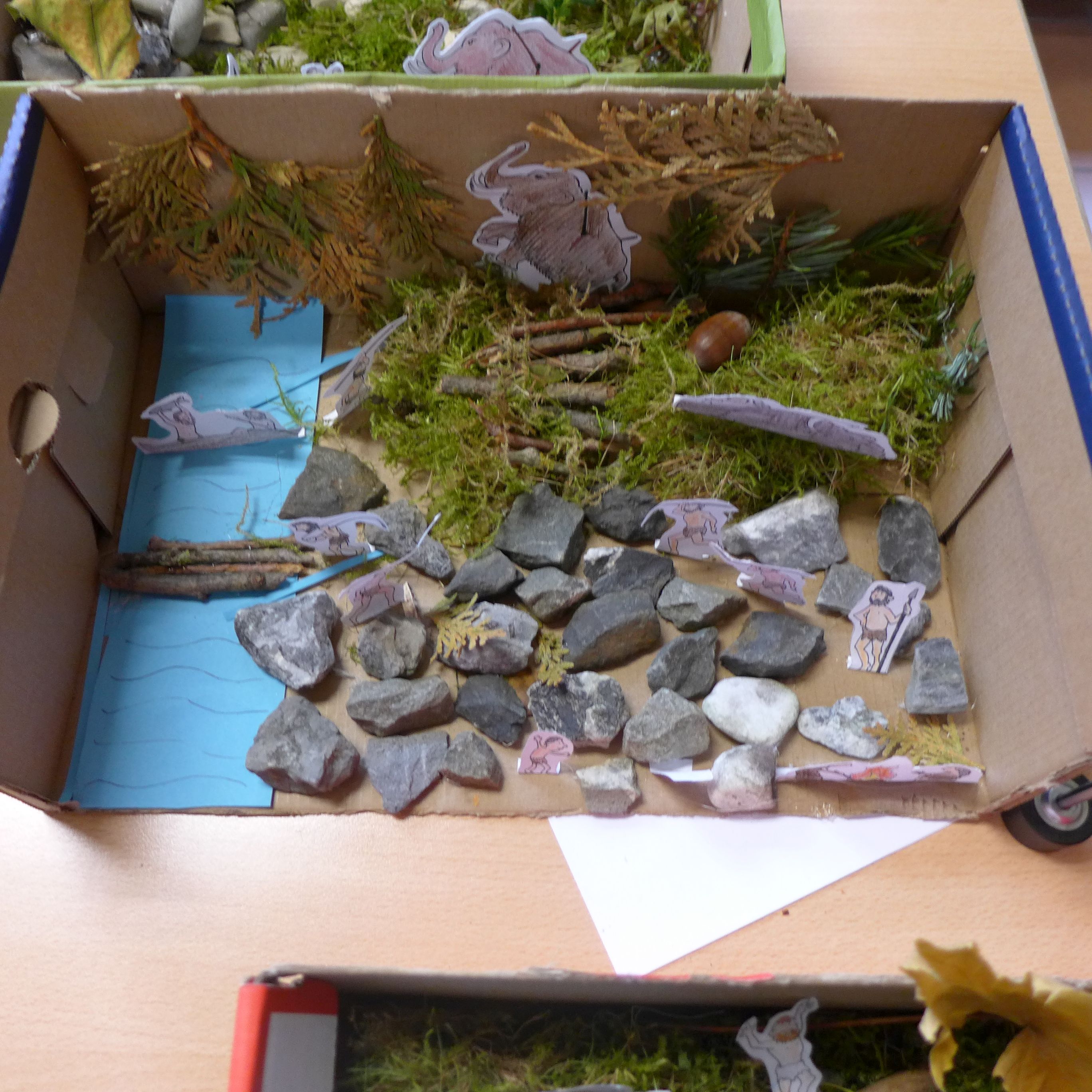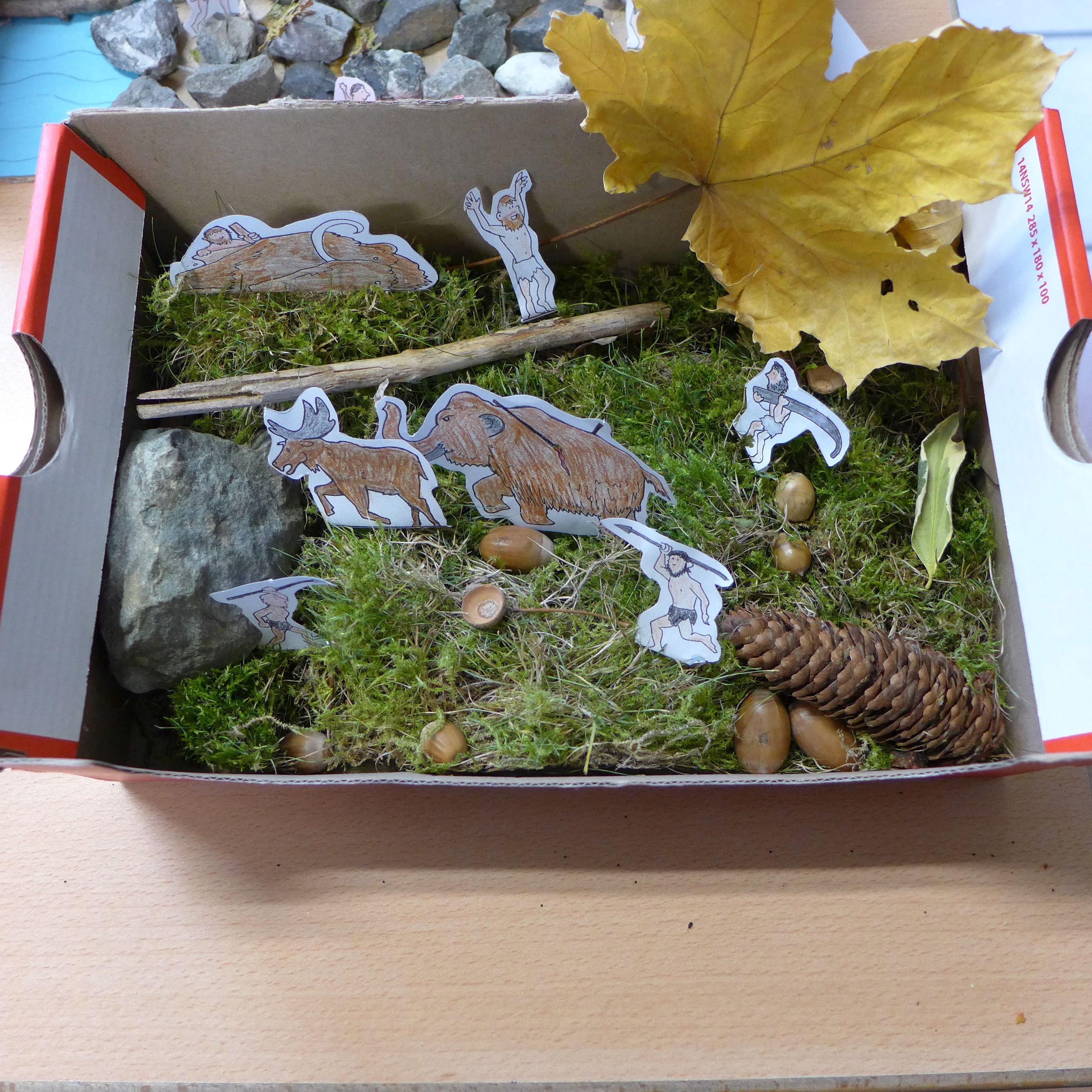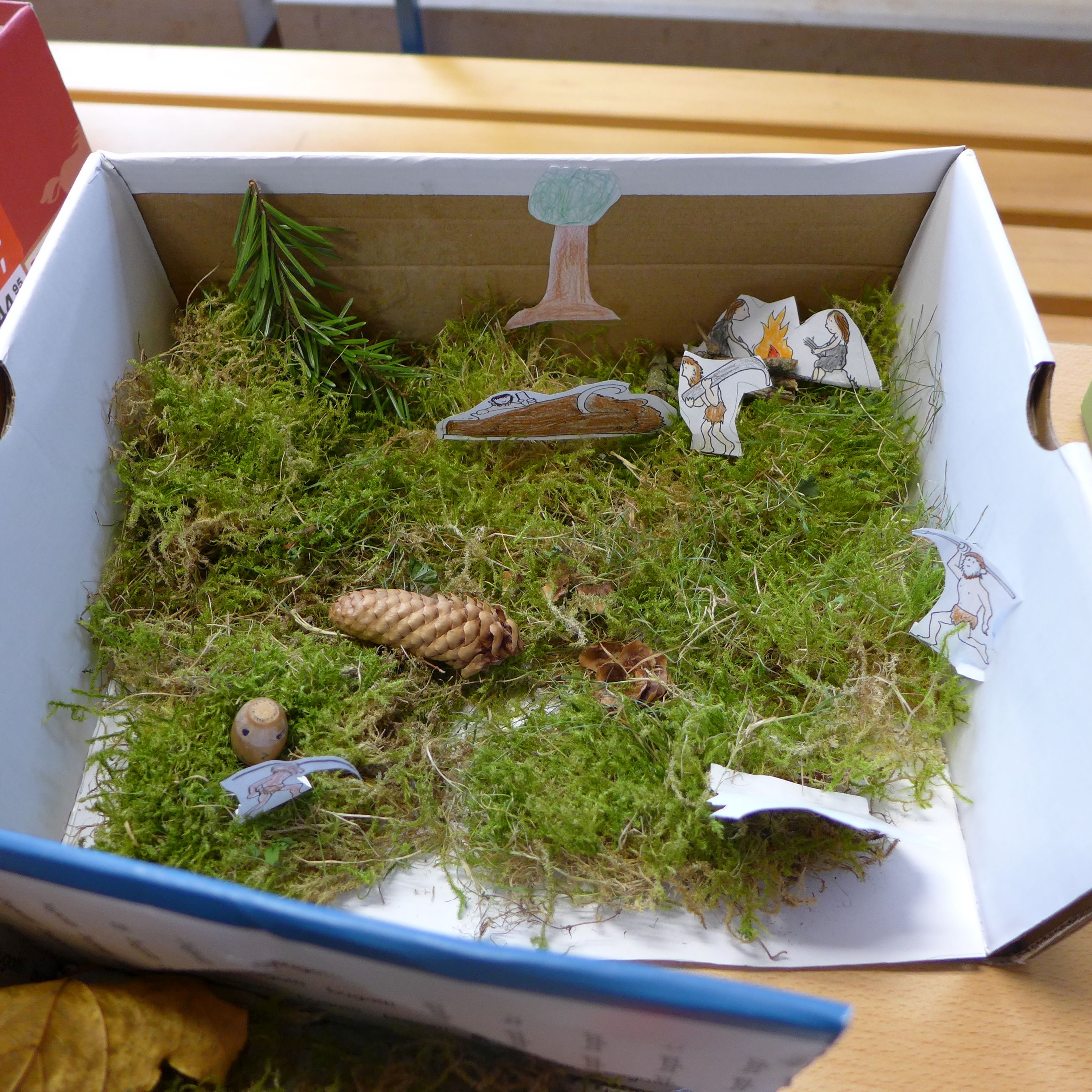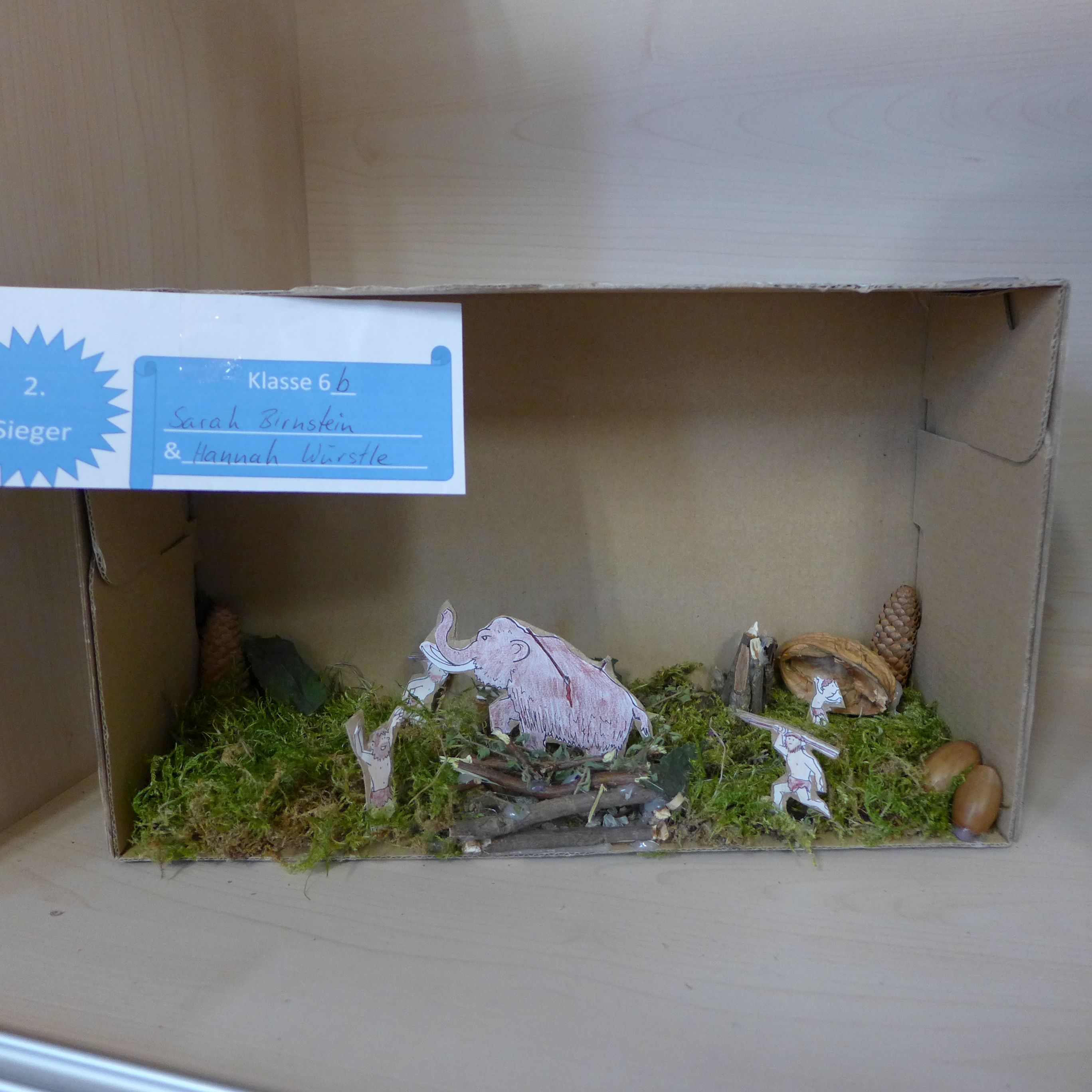 In einem dreistündigen Miniprojekt sollten die Schülerinnen und Schüler der sechsten Klassen im Fach Geschichte die Jagdszene durch das Darstellen einer Altsteinzeitlichen Jagdszene in einem Schuhkarton („History in a box“) weitererzählen.