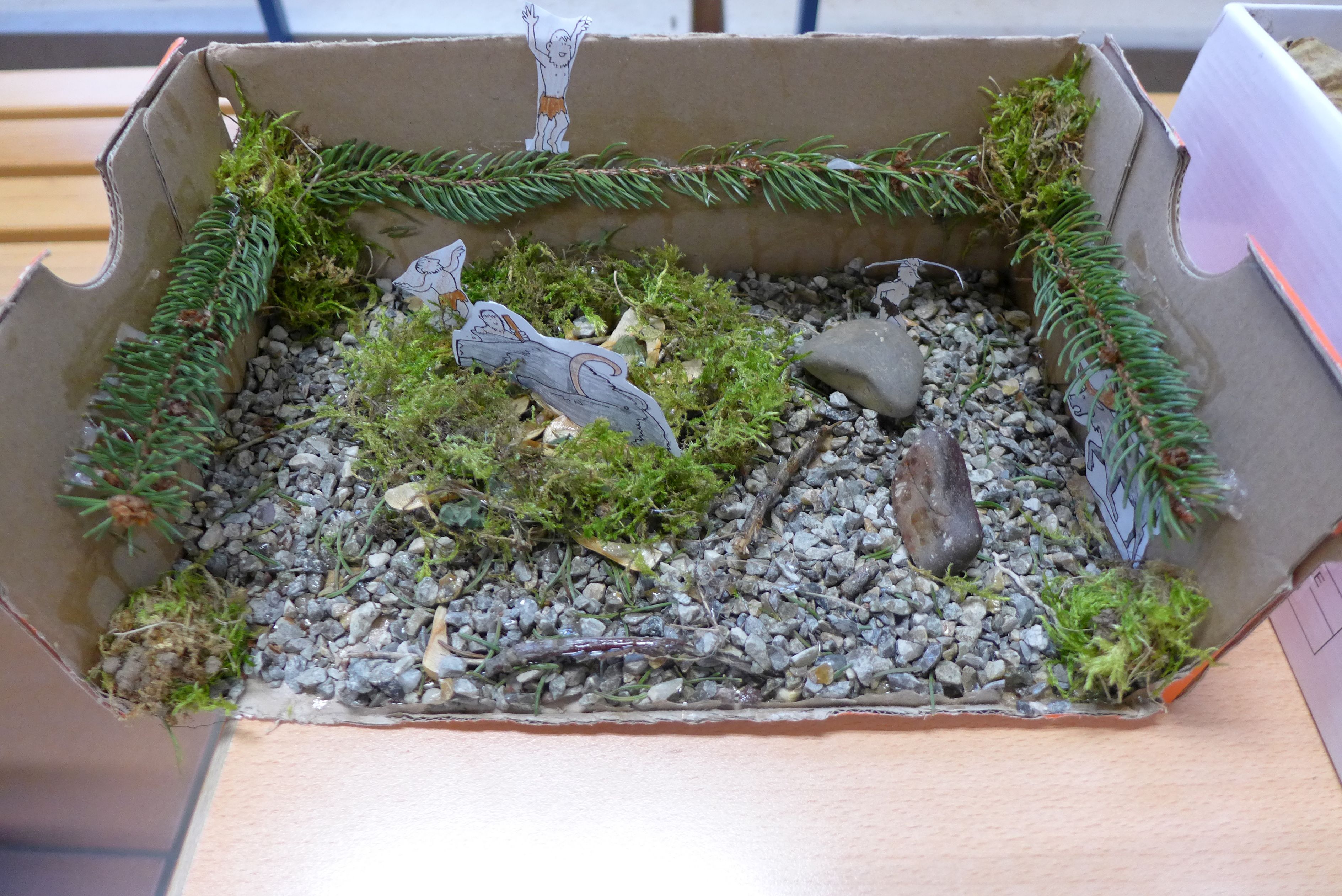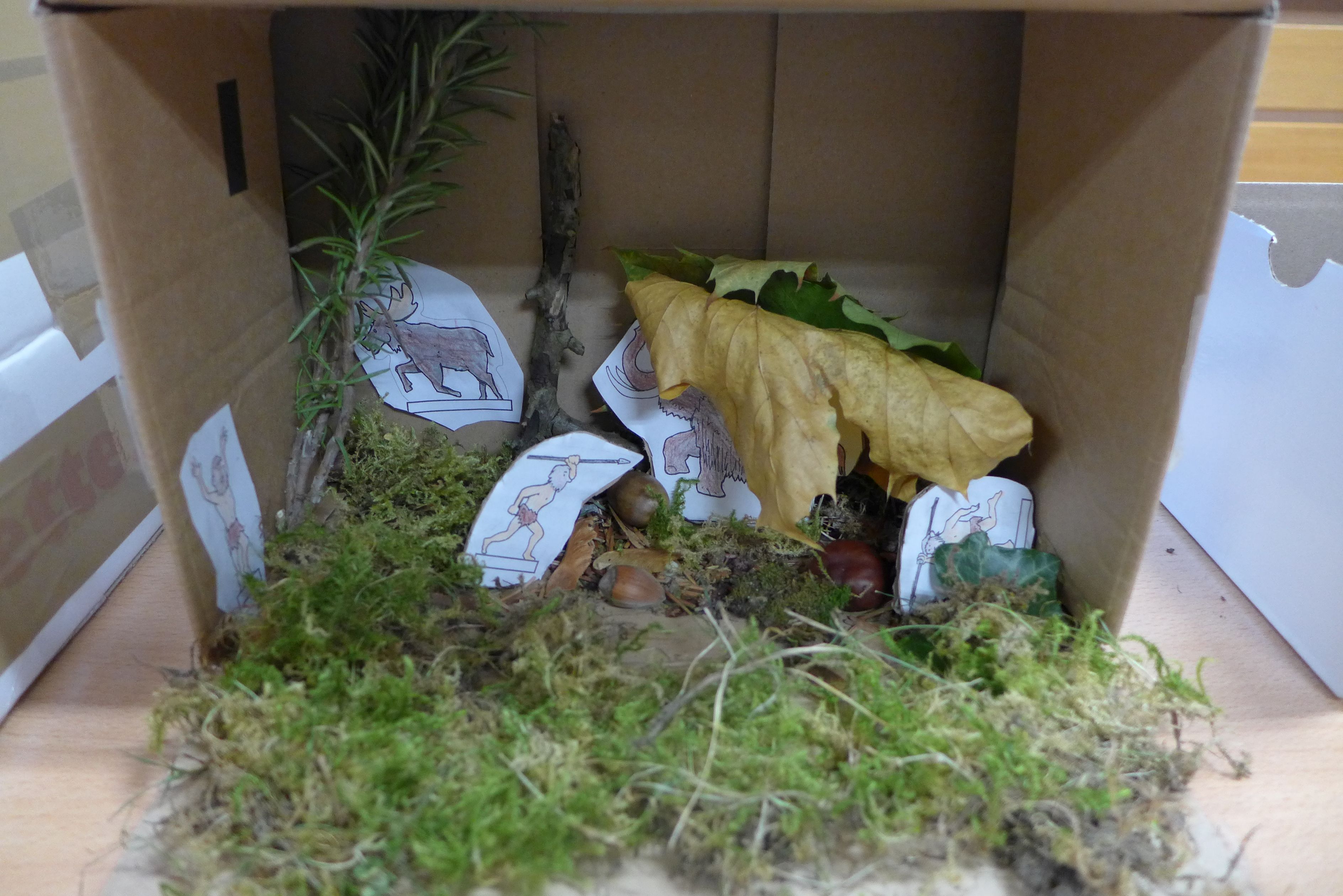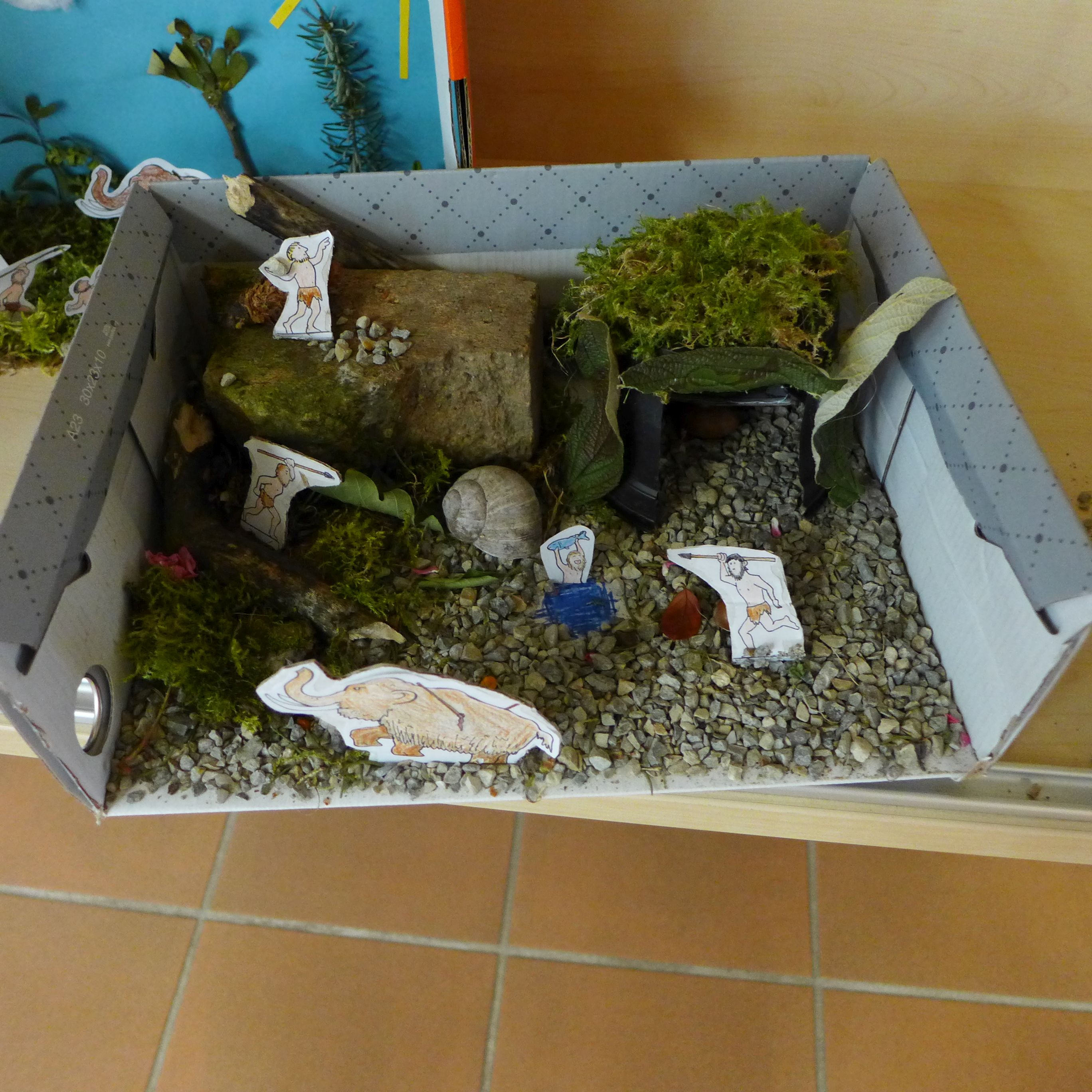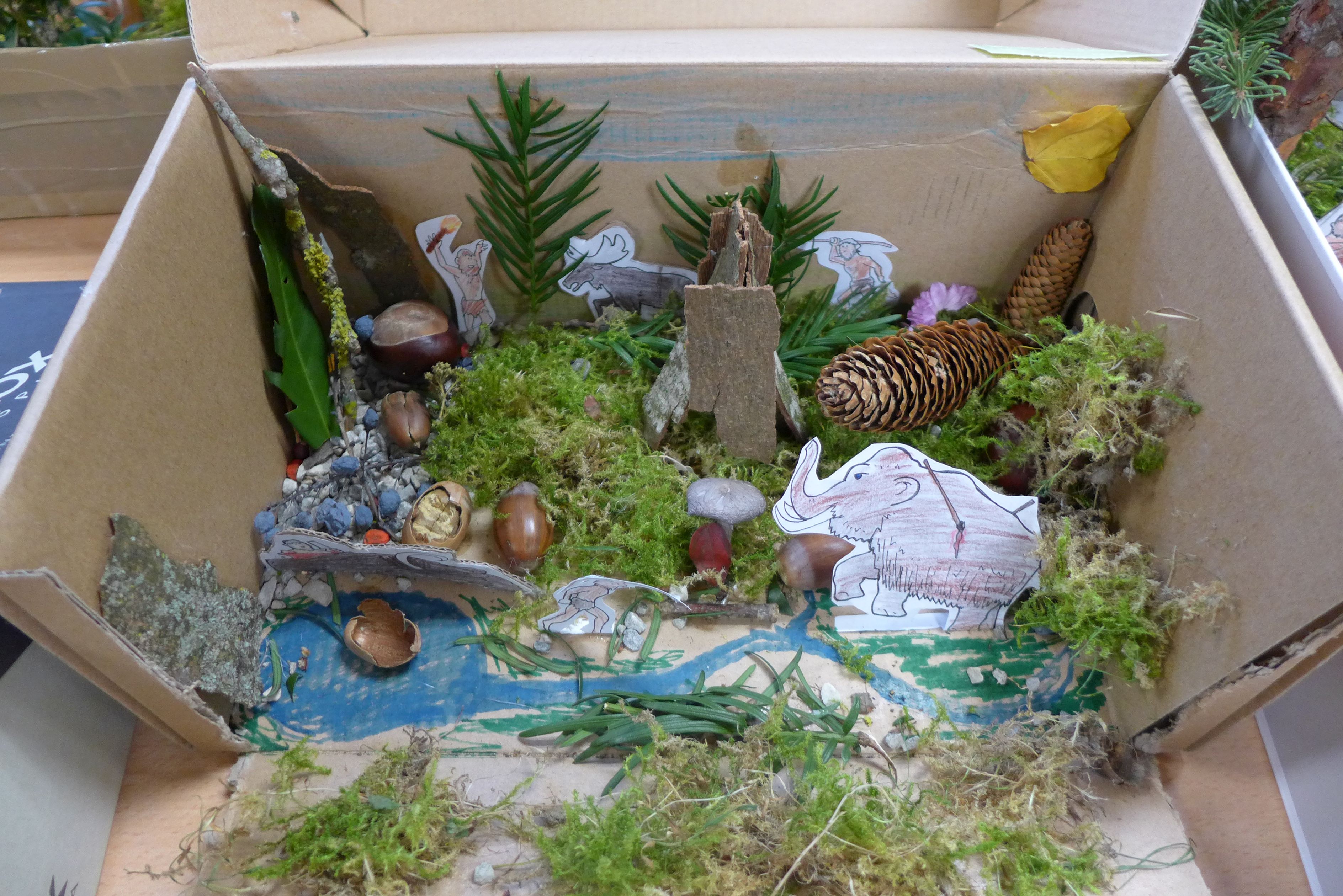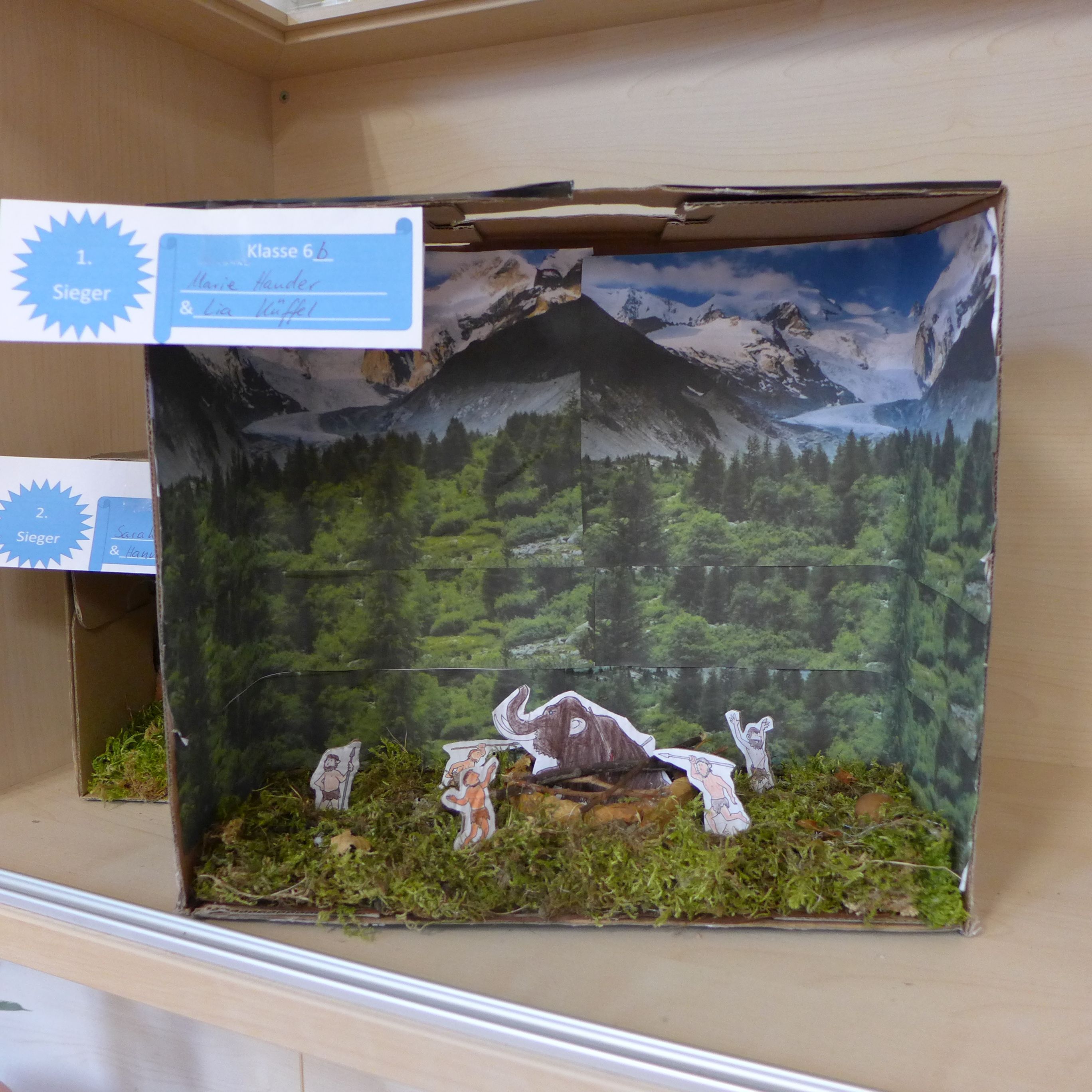 In einem dreistündigen Miniprojekt sollten die Schülerinnen und Schüler der sechsten Klassen im Fach Geschichte die Jagdszene durch das Darstellen einer Altsteinzeitlichen Jagdszene in einem Schuhkarton („History in a box“) weitererzählen.