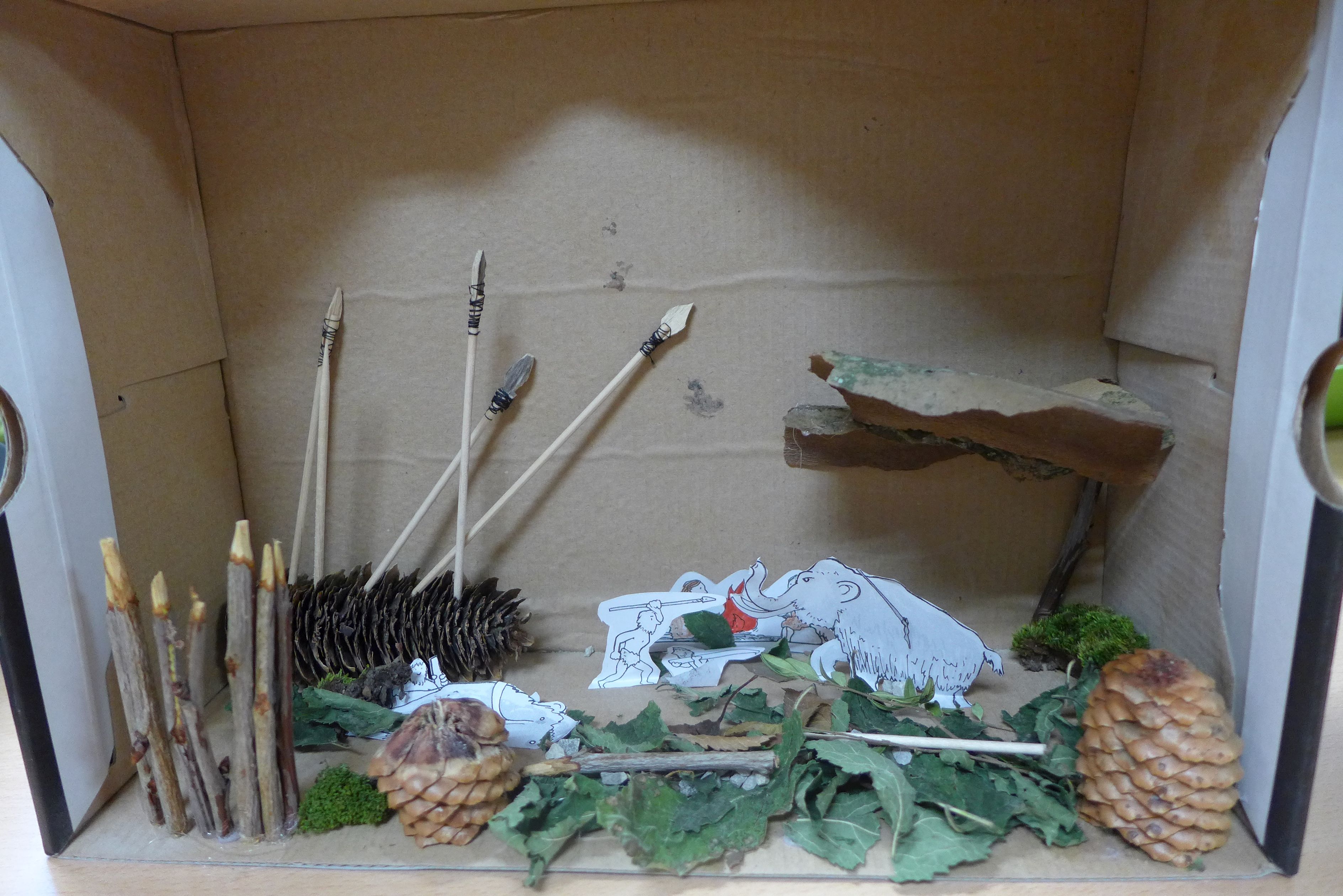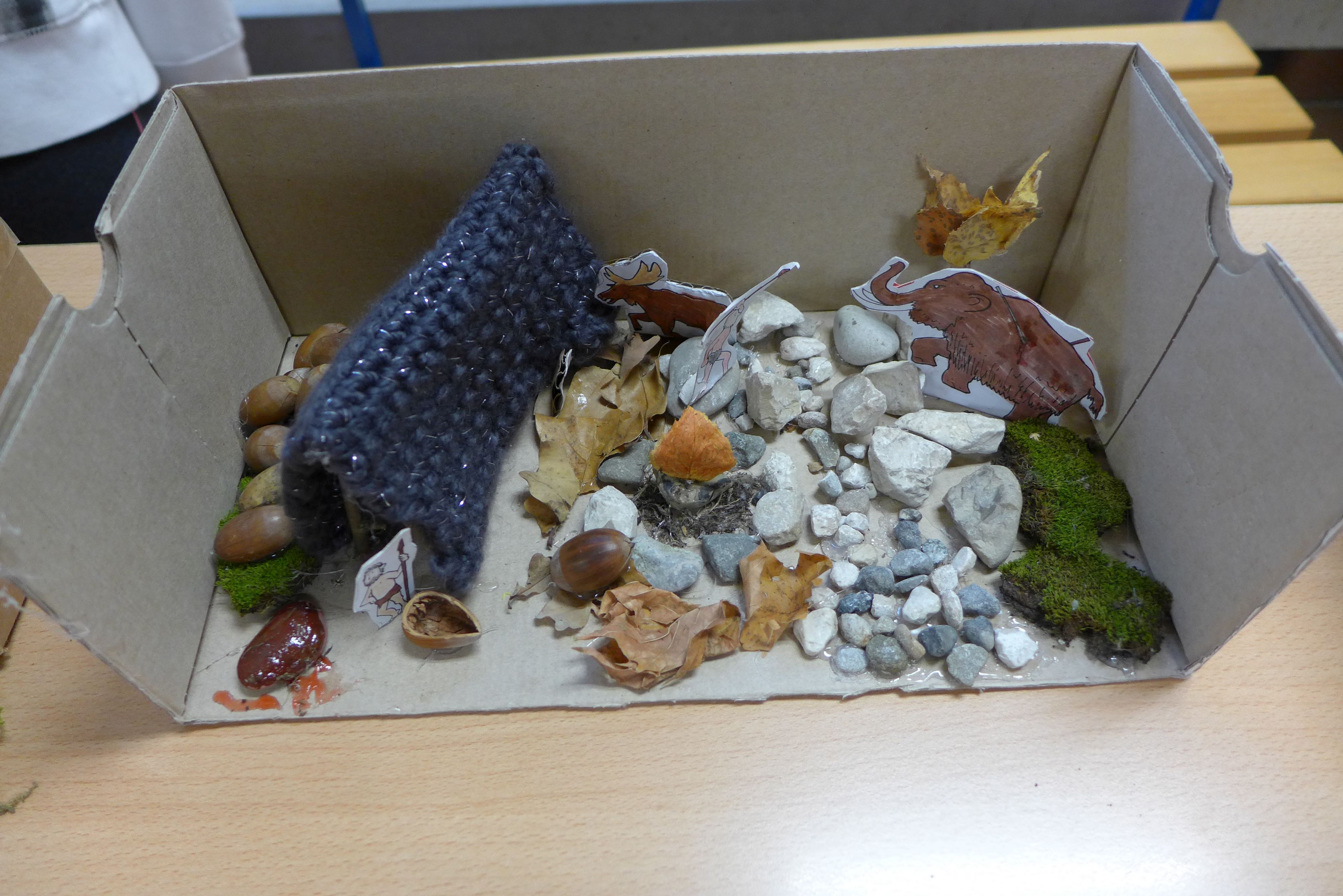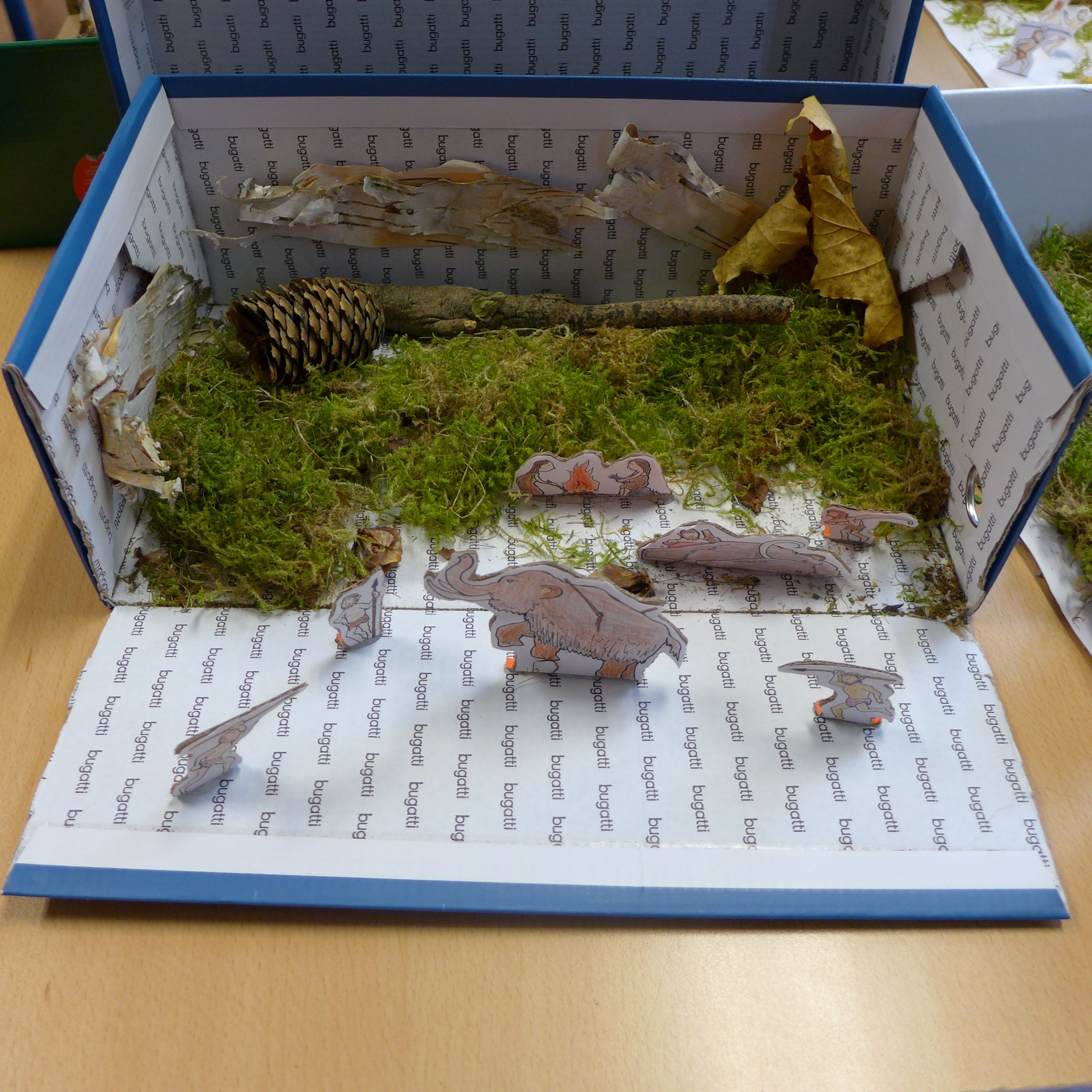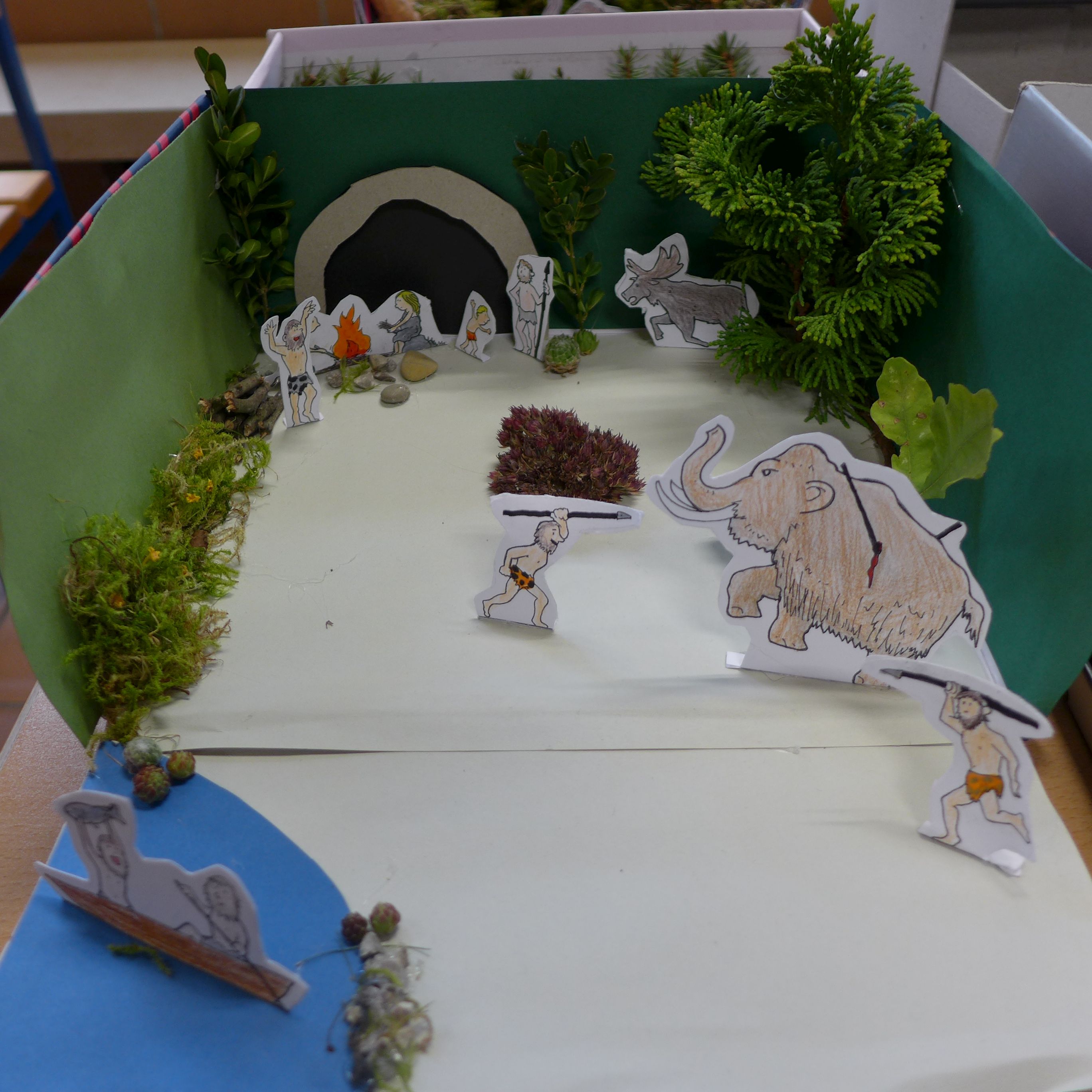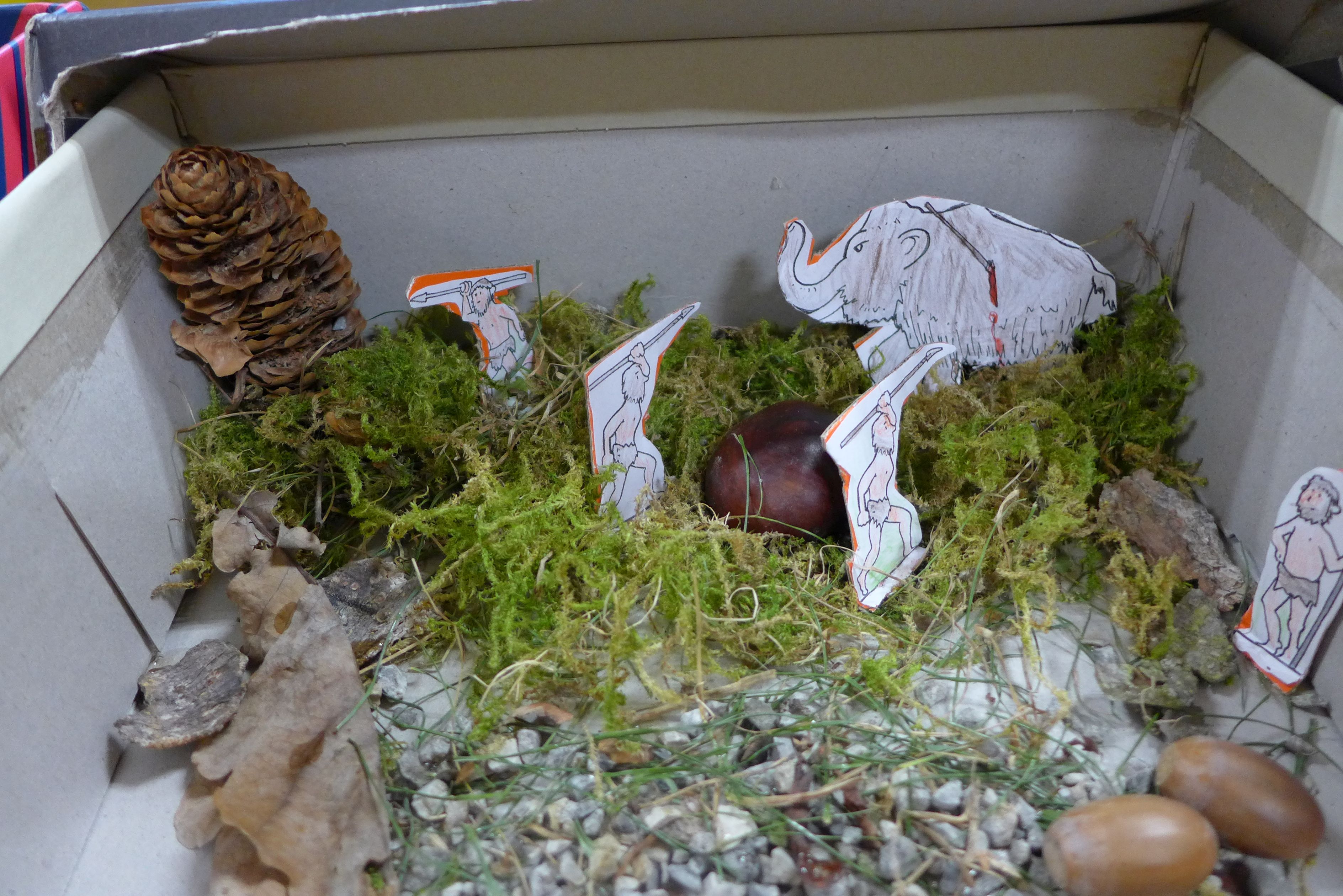 In einem dreistündigen Miniprojekt sollten die Schülerinnen und Schüler der sechsten Klassen im Fach Geschichte die Jagdszene durch das Darstellen einer Altsteinzeitlichen Jagdszene in einem Schuhkarton („History in a box“) weitererzählen.