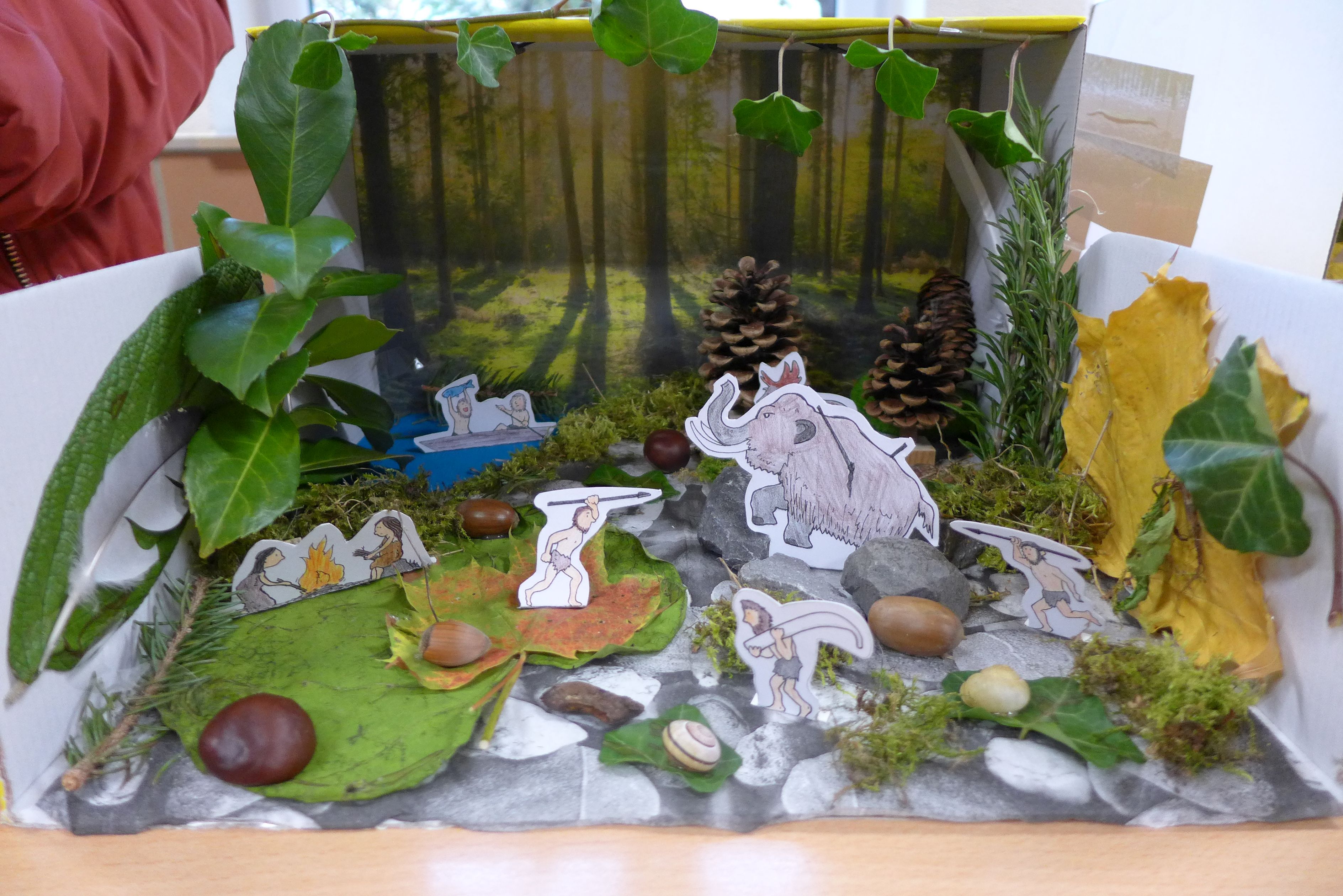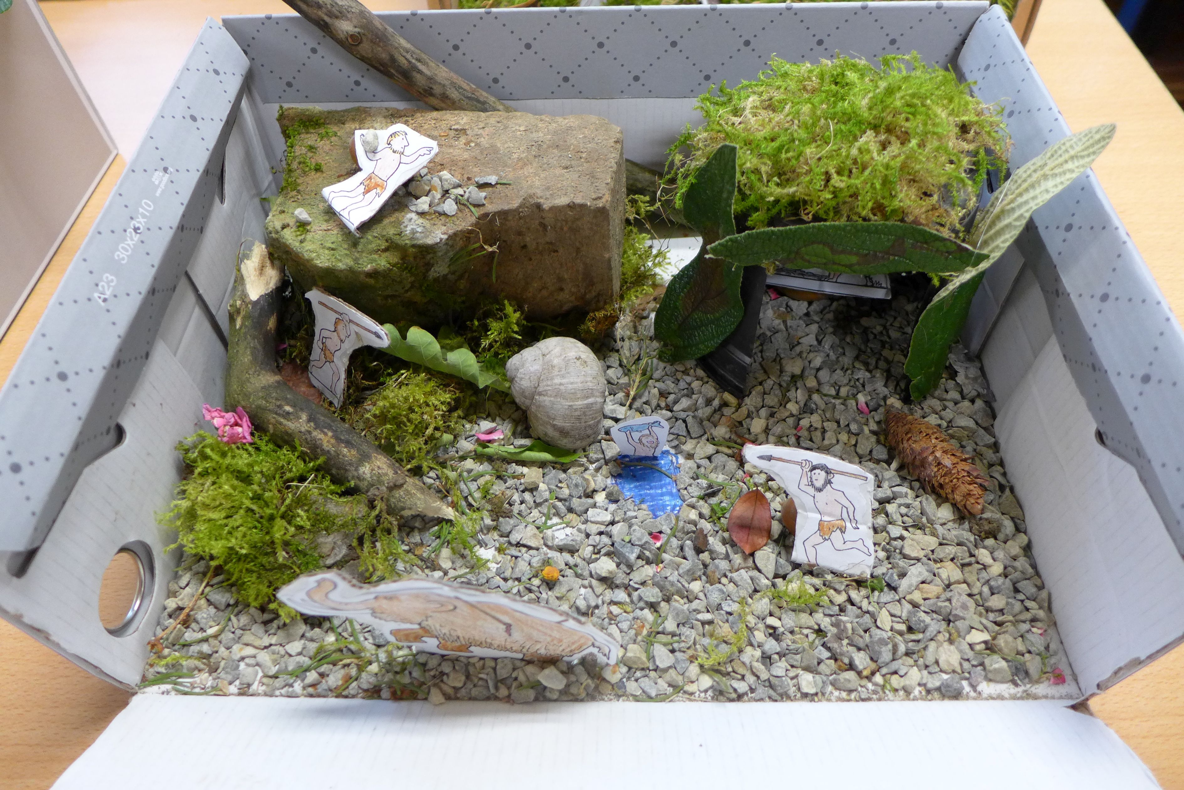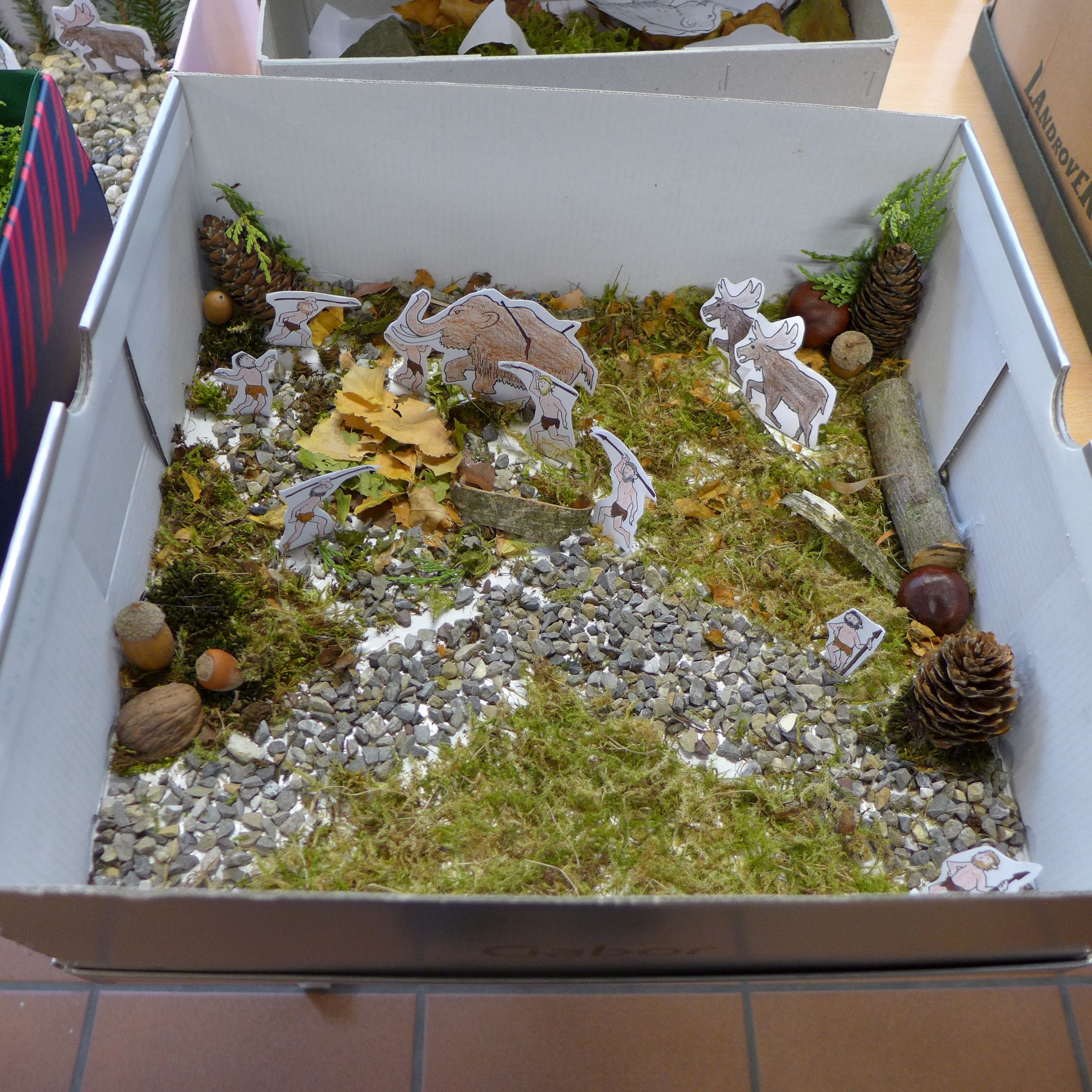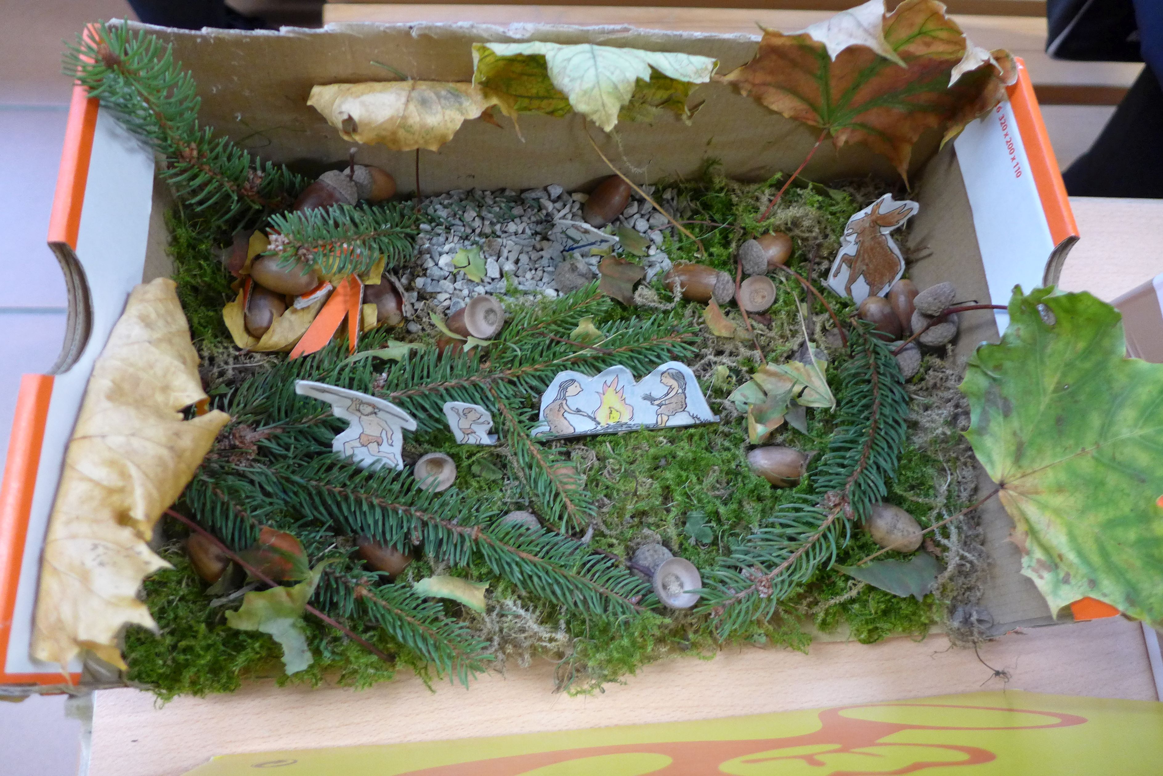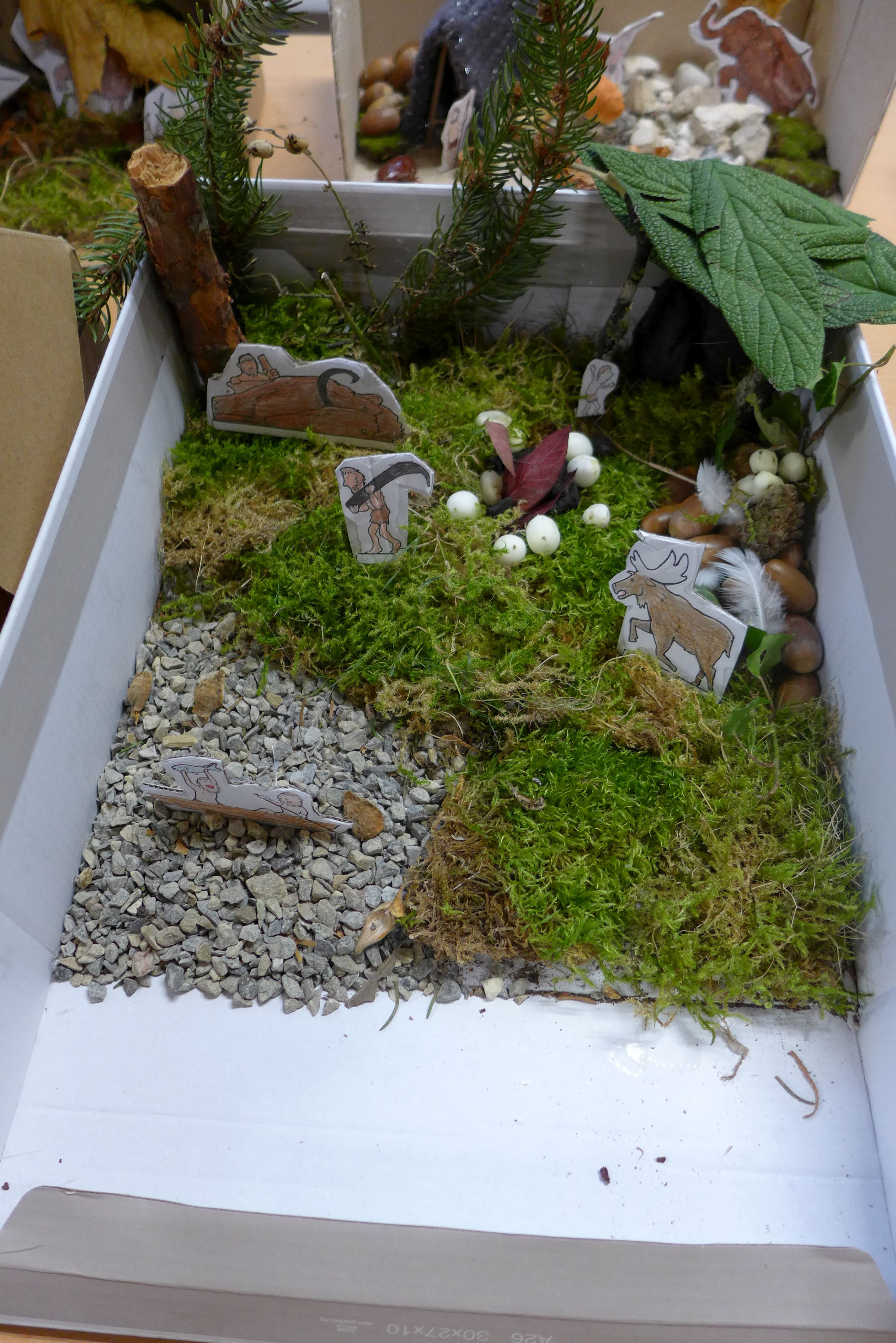In einem dreistündigen Miniprojekt sollten die Schülerinnen und Schüler der sechsten Klassen im Fach Geschichte die Jagdszene durch das Darstellen einer Altsteinzeitlichen Jagdszene in einem Schuhkarton („History in a box“) weitererzählen.