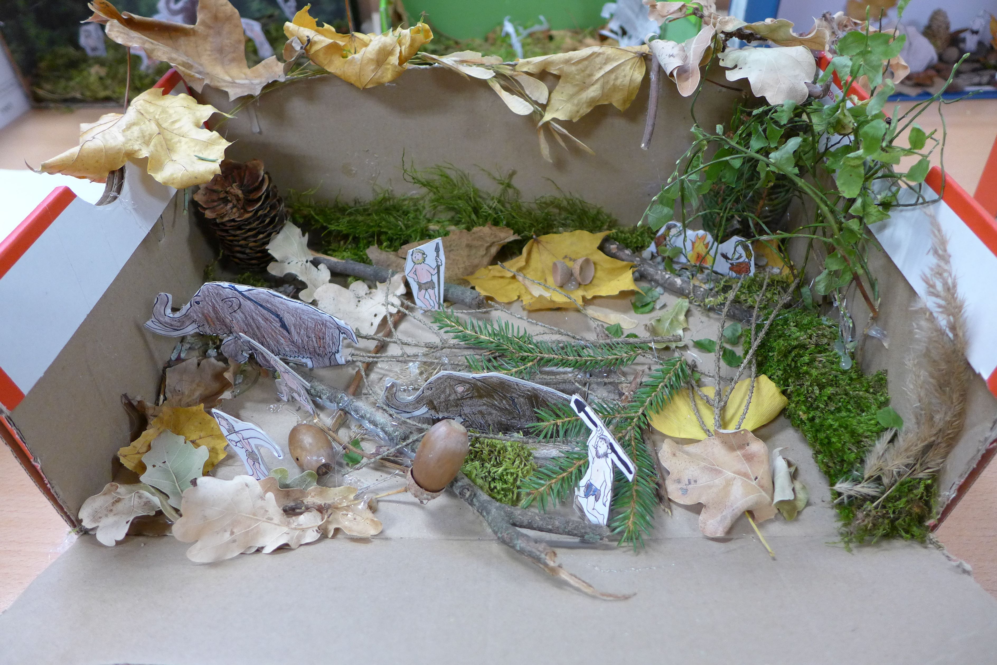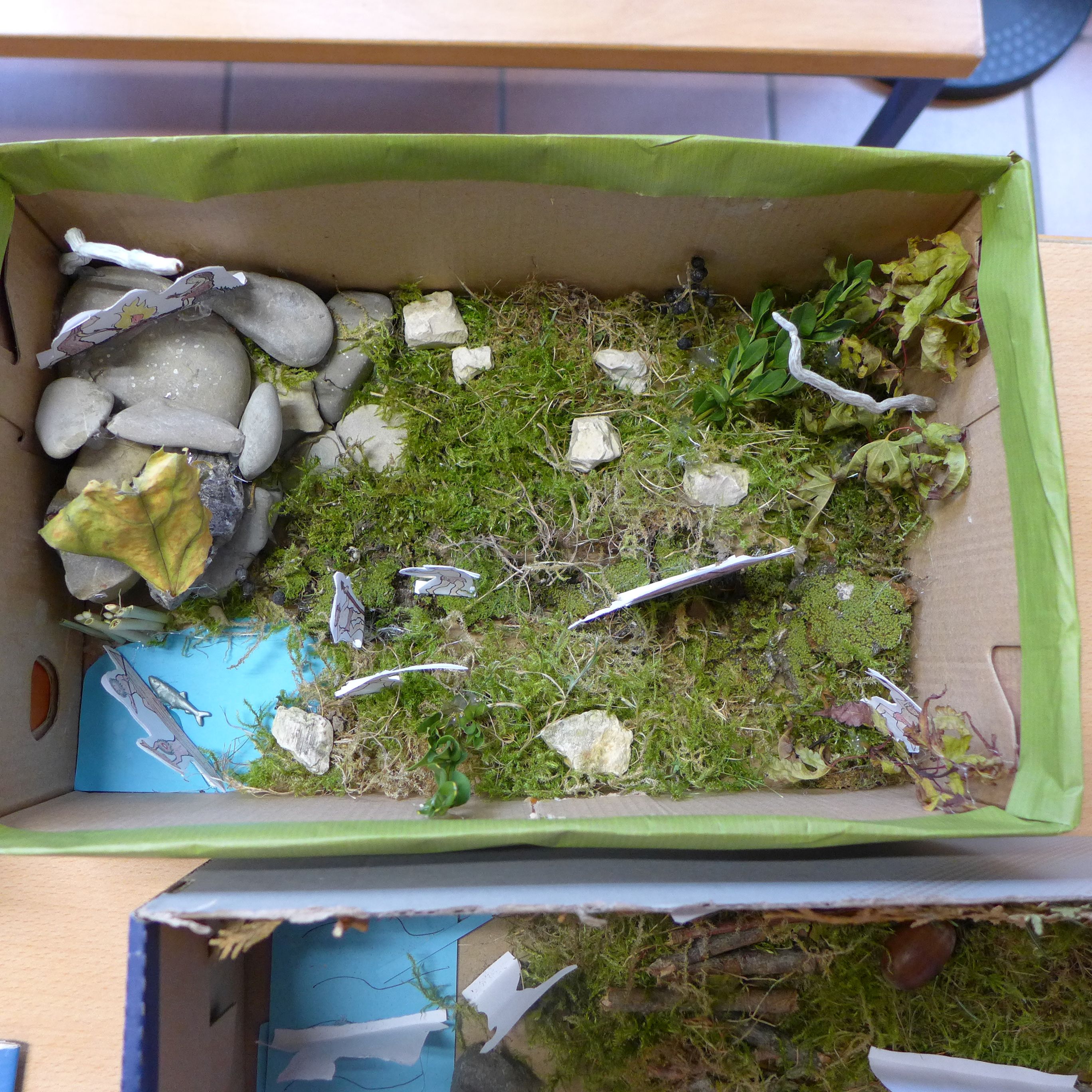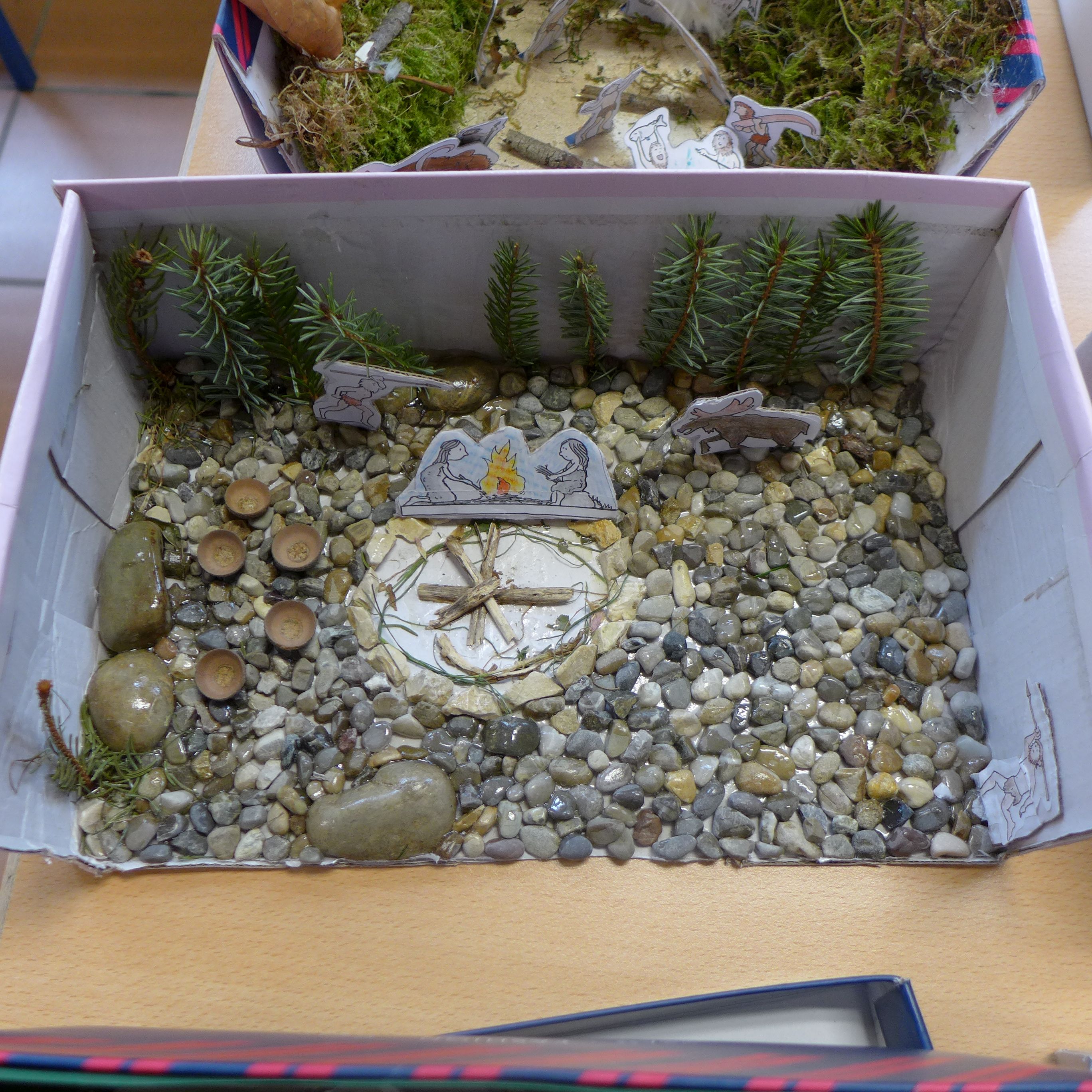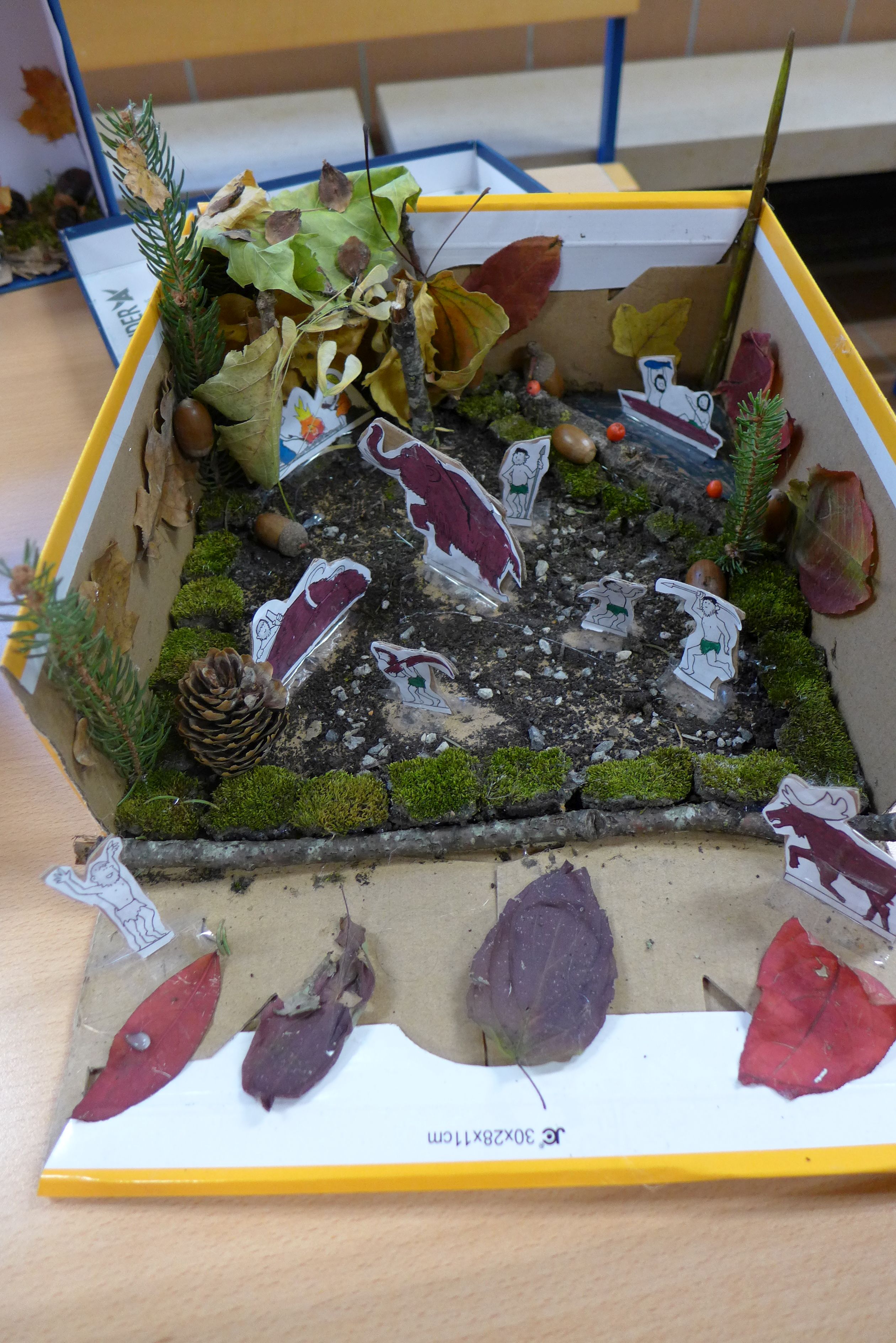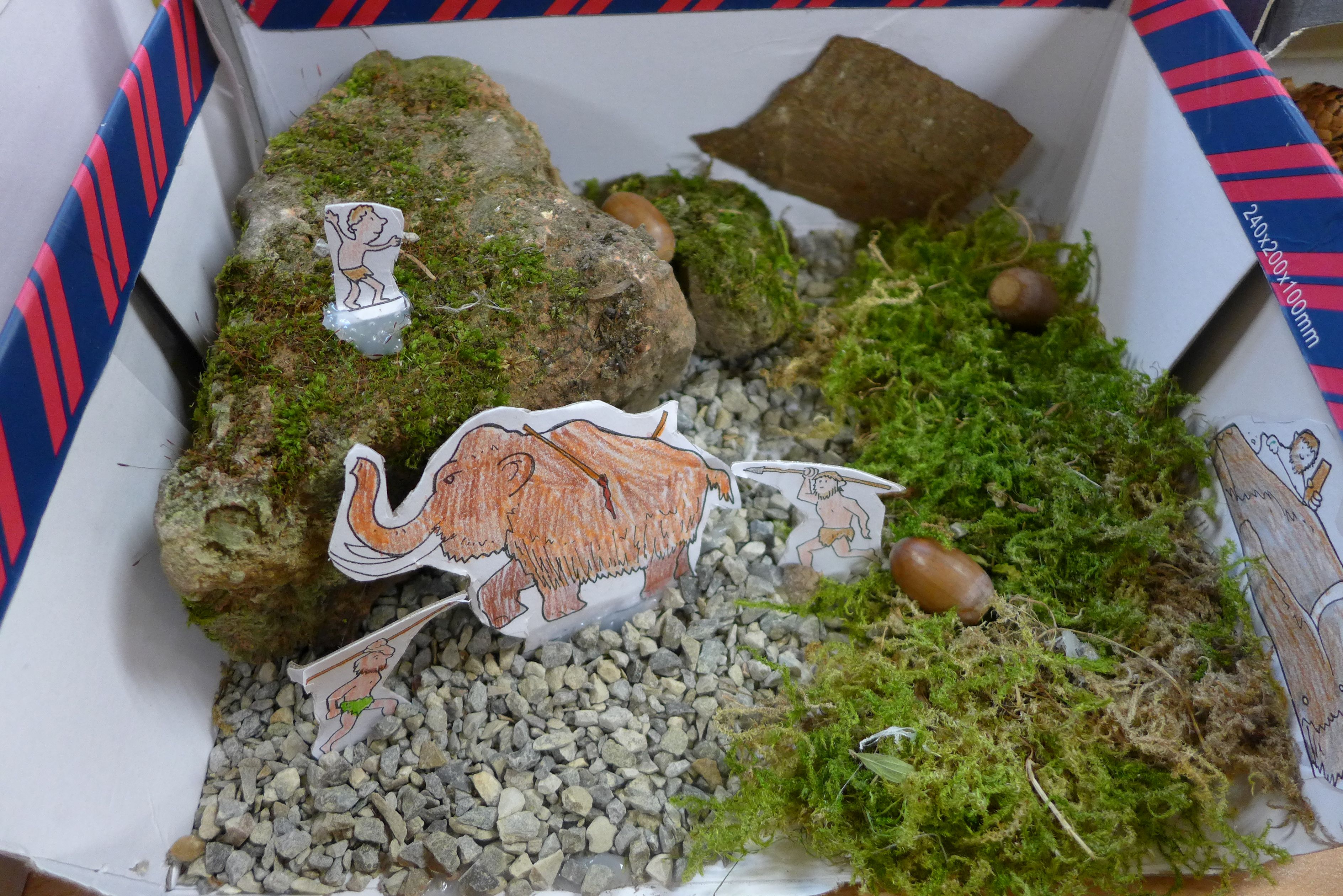 In einem dreistündigen Miniprojekt sollten die Schülerinnen und Schüler der sechsten Klassen im Fach Geschichte die Jagdszene durch das Darstellen einer Altsteinzeitlichen Jagdszene in einem Schuhkarton („History in a box“) weitererzählen.