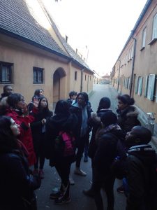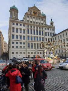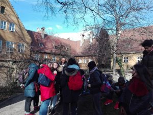 Um Bayern noch ein wenig besser kennenzulernen, stand als Ausflugsziel für Samstag die Stadt Augsburg auf dem Programm. Dort angekommen erhielten unsere französischen Gäste im Fugger und Welser Erlebnismuseum erste wichtige Informationen zu diesen beiden berühmten Augsburger Kaufmannsfamilien. Nach der Mittagspause – zum ersten Mal diese Woche kam sogar wie bestellt die Sonne durch die Wolken – ging es weiter zur Fuggerei, der ersten Sozialsiedlung der Welt. Diese einmalige Einrichtung beeindruckte nicht nur unsere Pariser Gäste, sondern auch unsere deutschen Schüler.