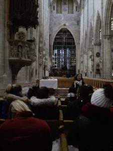 Nachmittags fuhren die französischen Gäste mit ihren deutschen correspondants nach Ulm, wo zuerst eine Stadtführung mit Besuch des Ulmer Münsters und anschließend eine Führung im Ulmer Museum auf dem Programm stand. Neben dem Löwenmenschen entdeckten wir hier auch die Bedeutung von Licht und Schatten in der Kunst – und in der Welt der Computerspiele!