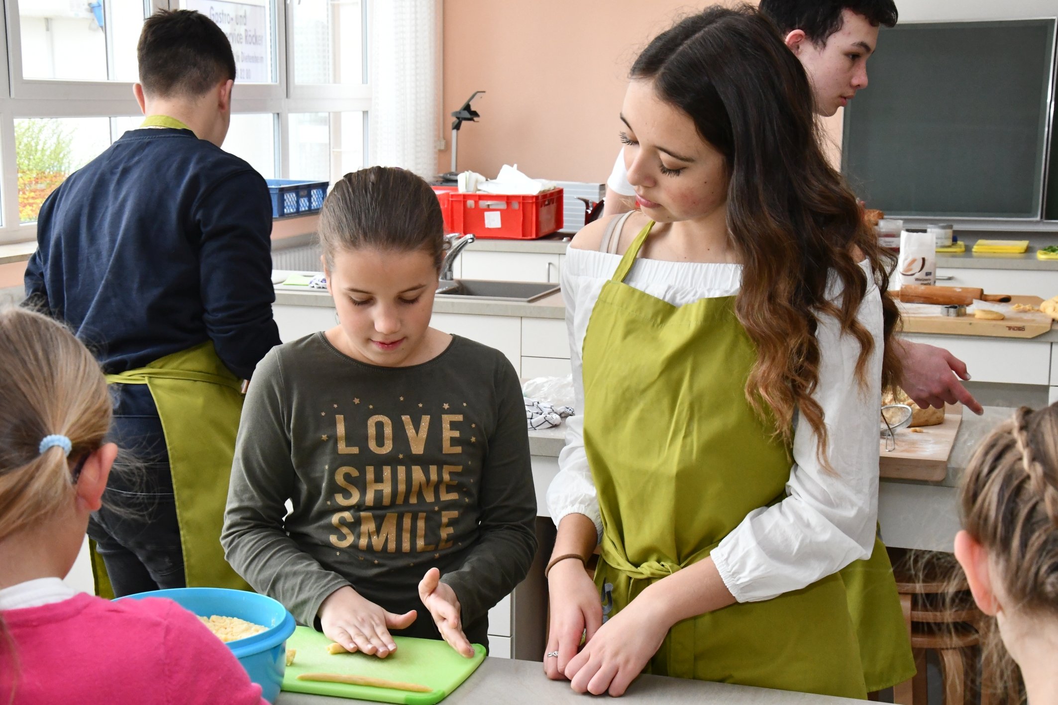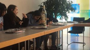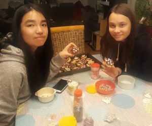 Dazu trafen sich am Montag Nachmittag alle Austauschpartner gemeinsam mit den Gasteltern und den LehrerInnen in der Schule zu einer Verabschiedungsfeier. Einige Mädchen bereiten dafür zuhause Muffins und Kuchen vor, gemeinsam mit ihren Austauschschülerinnen.