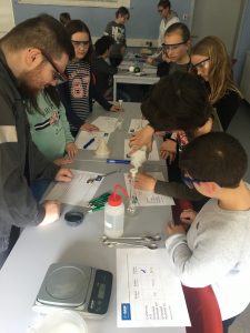 Der größte Teil war die praktische Erarbeitung des physikalischen Begriffs „Dichte“, der den jungen Forschern eine Menge Fingerspitzengefühl abverlangte. Am Ende gab es eine kurze Präsentation zu den Ausbildungsberufen der beiden Gäste: Es wurde genau erklärt, was der Unterschied zwischen einem Chemikanten und einem Chemielaboranten ist!