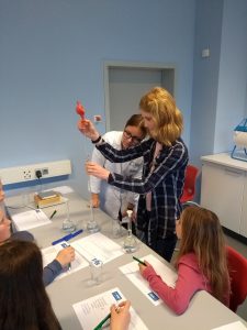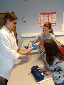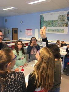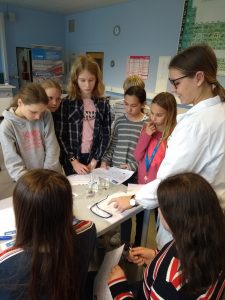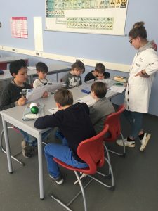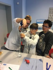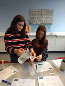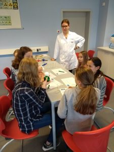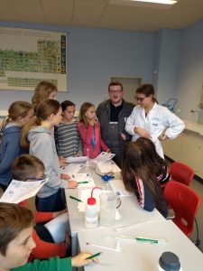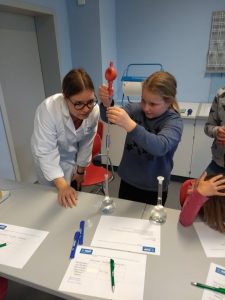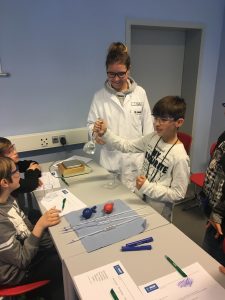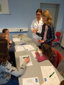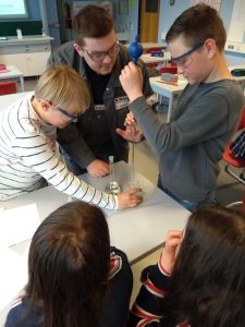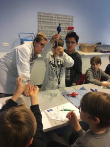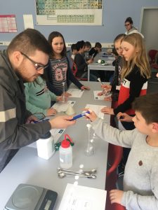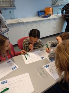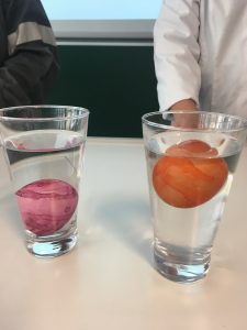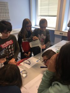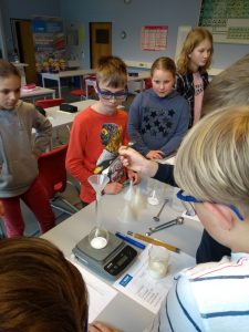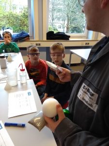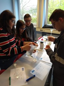 Der größte Teil war die praktische Erarbeitung des physikalischen Begriffs „Dichte“, der den jungen Forschern eine Menge Fingerspitzengefühl abverlangte. Am Ende gab es eine kurze Präsentation zu den Ausbildungsberufen der beiden Gäste: Es wurde genau erklärt, was der Unterschied zwischen einem Chemikanten und einem Chemielaboranten ist!