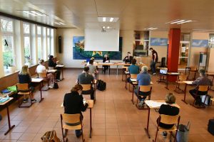 Damit für die 10. Klassen am Montag, den 27. April die Schule gut vorbereitet wieder starten kann, haben sich die Lehrkräfte am Freitag, den 24. April in einer Konferenz vorbereitet. Auch hier stand alles im Zeichen von Corona. Kolleginnen, die selbst nicht anwesend sein konnten, wurden per Videokonferenz zugeschaltet.