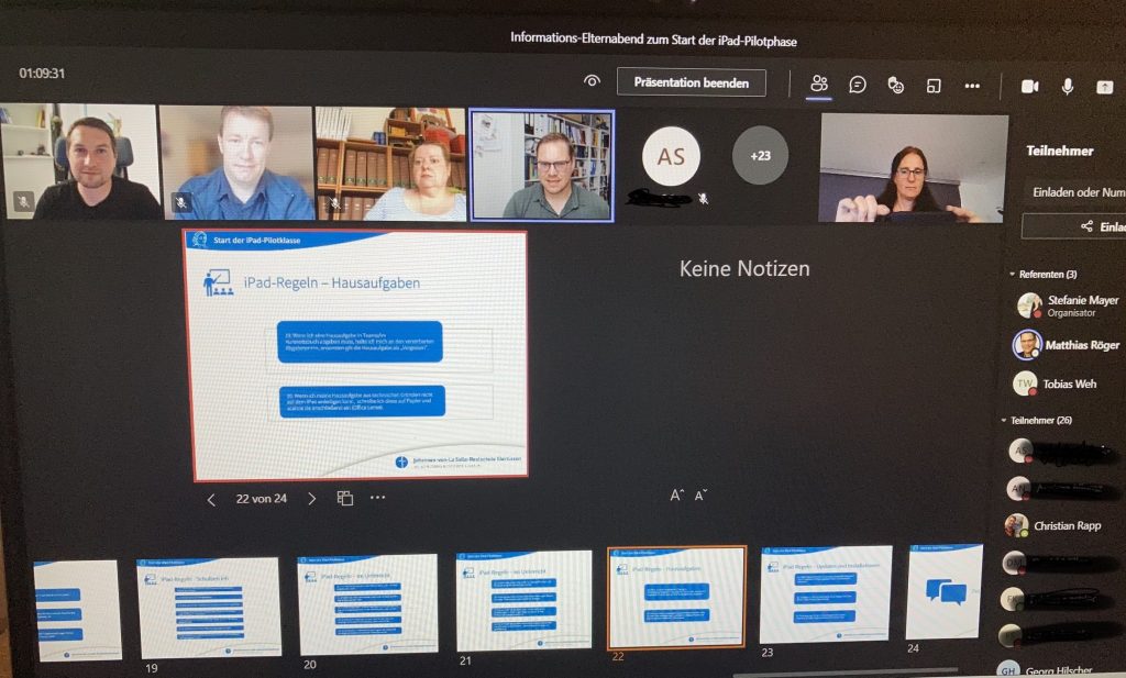 Endlich ist es soweit! Die 8a, unsere Pilotklasse in Sachen iPad-Nutzung im Unterricht, hat ihre Geräte bekommen. Um in der kommenden Woche einen reibungslosen Start zu gewähren, wurden die Eltern am 9. Juni vom iPad-Team, bestehend aus Tobias Weh, Matthias Röger und Stefanie Mayer, in einem Online-Elternabend über die Visionen des digitalen Unterrichts sowie die organisatorischen und unterrichtlichen Rahmenbedingungen informiert.