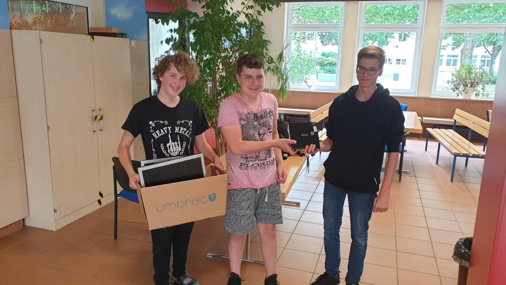 Noch vor Ferienbeginn übergaben Thilo Mandera und Marc Heß von der Computer AG zwei alte, von ihnen wiederaufbereitete PCs an Mathis Häußler.