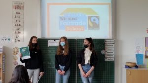 Am 29.4.2022 besuchten die Botschafter der Fairtrade-AG die Bischof-Ulrich-Grundschule. Gleich drei 4. Klassen besuchten unsere drei Fairtrade-Sprecherinnen und erklärten den Grundschülern die Bedeutung von fair gehandelten Waren. Nach einem anschaulichen Video-Clip und einem offenen Gespräch stellten sie unsere Fairtrade School vor und brachten ihre Überzeugung mit einem Bingo-Spiel spielerisch an „Mann“.