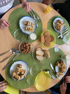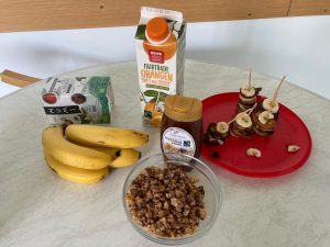 Es gab Bananen-Pancake-Spieße, Müsli, Honigwaffeln, Baguette mit Schokoaufstrich, Orangensaft und Bananenmilch.