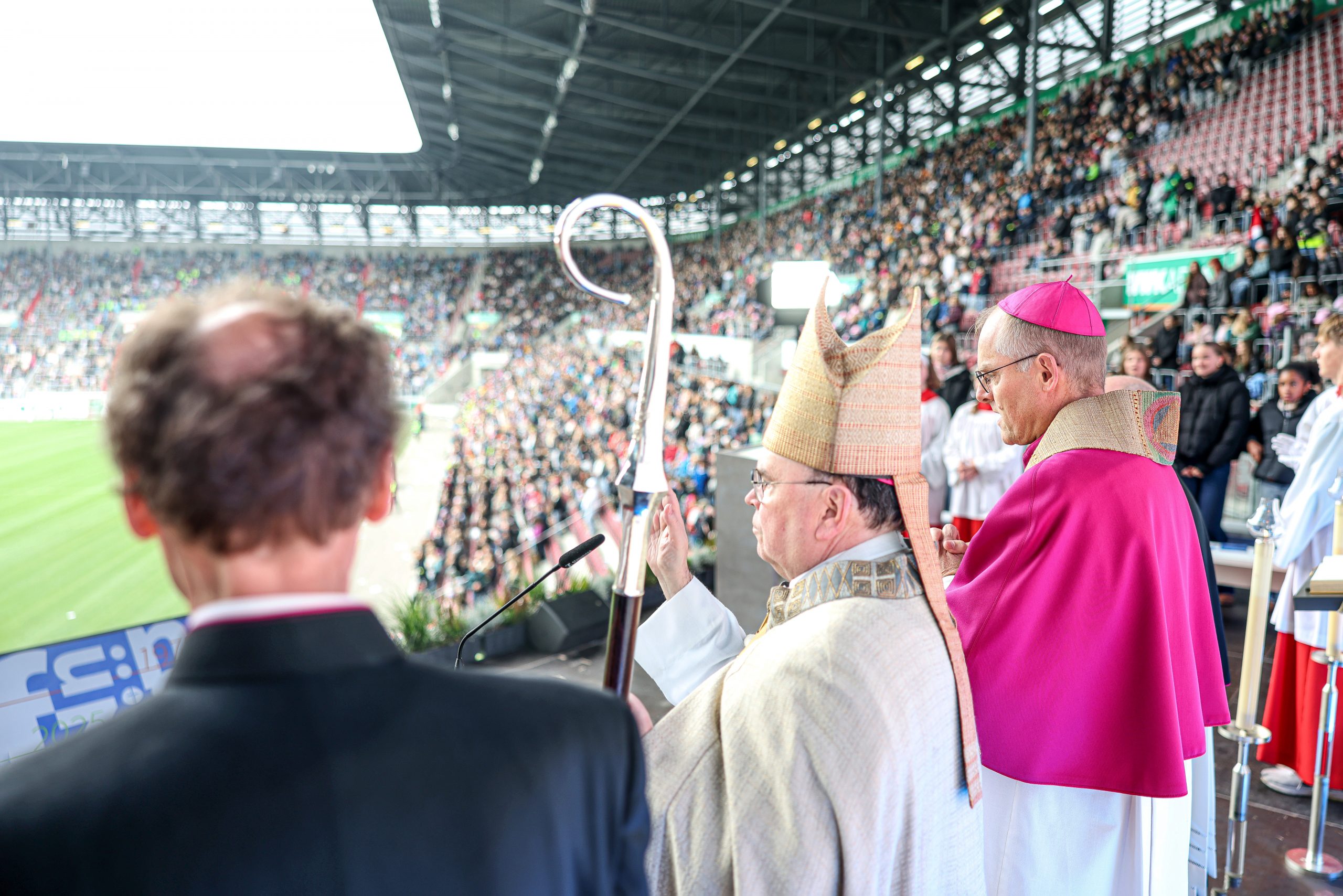 Übertroffen wurde die Musik nur von Bischof Bertrams humorvoller und zugleich tiefsinniger Ansprache. Mit einem Augenzwinkern griff er das Fußball-Motto des Tages auf und verwandelte das „Halleluja“ kurzerhand in einen echten Stadion-Ruf: „Gebt mir ein H, gebt mir ein A …!“ – rief er in die Menge, und 20.000 Stimmen antworteten begeistert. In diesem Augenblick verschmolzen Stadionjubel und Gotteslob zu einem einzigen, mitreißenden „Halleluja“. So wurde aus dem alten hebräischen Wort für Lob und Freude ein kraftvoller Ruf, der alle im Stadion vereinte.